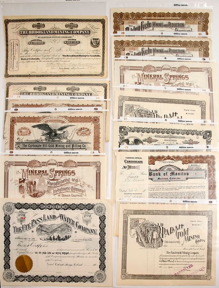 2 Ute Pass Land and Water u/i,2 Mineral Springs Manufacturing and Investment Co. of Denver u/i, 2 Carbonate Hill Gold Mining and Milling i/c 1899, 2 Brookland Mining i/u 1882, Bank of Manitou i/p 1934, Argonaut Gold Mining i/u 1906, 2 Parah Gold Mining u/c, 2 Golden Cycle Mining and Reduction i/u 1917 HWAC# 61750 Date: Location: Colorado