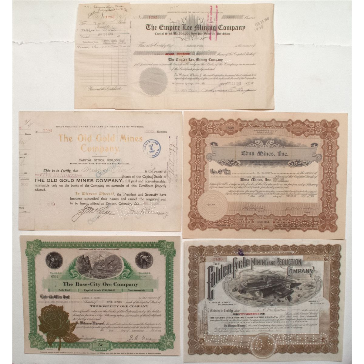 Lot of 5 mining stocks. Cripple Creek District. Included are: 1) Rose City Ore Company. Incorporated in Colorado in 1925. Cert. #6592 issued to James A. Rich in 1928 for 1000 shares. Signed by J.A. Craig, president (stamped signature) and E. Tinsley, secretary. Large gilt rose seal. U/C. Printer: Goes. The company owned the Ada Bell and Little Edith gold mines on the south side of Raven Hill in the Cripple Creek District. It also owned a flotation mill at Empire, Clear Creek county, and operated principally, if not entirely, on ores from the Gold Dirt Mining Company. VF; 2) Edna Mines, Inc. Incorporated in Colorado. Cert. #1839 issued to B.W. Barnett in 1925 for 1000 shares. Signed by A. Allenbaum, president and H. A. Mirens, secretary (stamped signatures). U/C. Printer: Goes. VF; 3) Old Gold Mines Company. Incorporated in Wyoming. Cert. #3502 issued to Maurice Ober in 1906 for 500 shares. Signed by Jon. Drumming, president, and J. McCall, secretary. Cancelled. No printer. Stub re-glued to left end. VF; 4) Empire Lee Mining Company. Incorporated in Colorado in 1923. Cert. #1295 issued to Alfred Post in 1945 for 700 shares. Signed by Merrill E. Shoup, president and H. Bates, secretary. Cancelled. Printer: Out West Ptg. & Stay Co., Colo. Spgs. A gold mining company formed as the result of the reorganization of the Isabella Mines Co. The mine was developed by 3 shafts. At about the time the certificate was issued the stock was selling for about 1ct. per share. Shoup was the son of Soliver Henry Shoup, governor of Colorado from 1919-1923. Merrill Shoup was an attorney and director, treasurer, or president of several mining companies and a bank. Stub glued to left border. VF; 5) Golden Cycle Mining and Reduction Company. Incorporated in W. Virginia in 1895. Cert. #6430 issued to L.P. McQuillin in 1917 for 500 shares. Signed by E.P. Shove, president, and H.M. Ragle, secretary. Cancelled. No printer. Organized by A.E. Carlton, one of the great achievers of Cripple Creek. At the time this certificate was issued, the company was processing about 500,000 tons of gold ore annually. Eugene Shove was president of the Elkton Mine. He and A.E. Carlton and 3 other Cripple Creek dignitaries bought the Golden Cycle Mill and associated properties. The company processed most of the Cripple Creek ore. VF. Date 1920s - 1940s Cripple Creek, CO hwac 9983