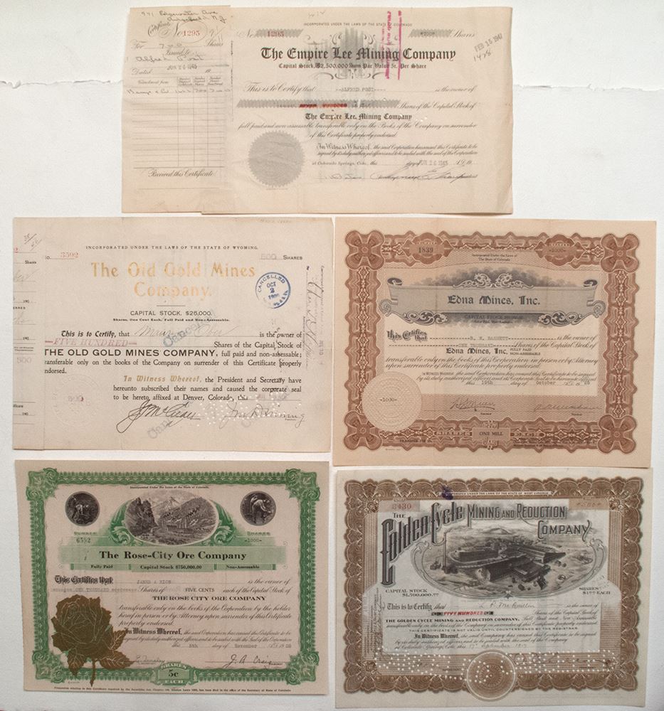 Lot of 5 mining stocks. Cripple Creek District. Included are: 1) Rose City Ore Company. Incorporated in Colorado in 1925. Cert. #6592 issued to James A. Rich in 1928 for 1000 shares. Signed by J.A. Craig, president (stamped signature) and E. Tinsley, secretary. Large gilt rose seal. U/C. Printer: Goes. The company owned the Ada Bell and Little Edith gold mines on the south side of Raven Hill in the Cripple Creek District. It also owned a flotation mill at Empire, Clear Creek county, and operated principally, if not entirely, on ores from the Gold Dirt Mining Company. VF; 2) Edna Mines, Inc. Incorporated in Colorado. Cert. #1839 issued to B.W. Barnett in 1925 for 1000 shares. Signed by A. Allenbaum, president and H. A. Mirens, secretary (stamped signatures). U/C. Printer: Goes. VF; 3) Old Gold Mines Company. Incorporated in Wyoming. Cert. #3502 issued to Maurice Ober in 1906 for 500 shares. Signed by Jon. Drumming, president, and J. McCall, secretary. Cancelled. No printer. Stub re-glued to left end. VF; 4) Empire Lee Mining Company. Incorporated in Colorado in 1923. Cert. #1295 issued to Alfred Post in 1945 for 700 shares. Signed by Merrill E. Shoup, president and H. Bates, secretary. Cancelled. Printer: Out West Ptg. & Stay Co., Colo. Spgs. A gold mining company formed as the result of the reorganization of the Isabella Mines Co. The mine was developed by 3 shafts. At about the time the certificate was issued the stock was selling for about 1ct. per share. Shoup was the son of Soliver Henry Shoup, governor of Colorado from 1919-1923. Merrill Shoup was an attorney and director, treasurer, or president of several mining companies and a bank. Stub glued to left border. VF; 5) Golden Cycle Mining and Reduction Company. Incorporated in W. Virginia in 1895. Cert. #6430 issued to L.P. McQuillin in 1917 for 500 shares. Signed by E.P. Shove, president, and H.M. Ragle, secretary. Cancelled. No printer. Organized by A.E. Carlton, one of the great achievers of Cripple Creek. At the time this certificate was issued, the company was processing about 500,000 tons of gold ore annually. Eugene Shove was president of the Elkton Mine. He and A.E. Carlton and 3 other Cripple Creek dignitaries bought the Golden Cycle Mill and associated properties. The company processed most of the Cripple Creek ore. VF.