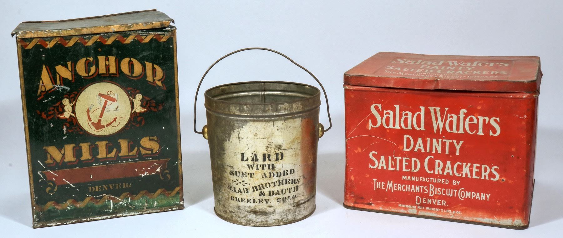 Lot of 3 Colorado tins. c. 1920 red Merchants Biscuit, Denver, 7.25 in. lid dent, light rust. c. c. 1870's-80's Anchor Mills, Denver, 9.75 in. broken lid hinge paint loss. c. 1900 ?aab Brothers & Dauth, Greeley lard with handle, no lid, 6.25". Denver/Greeley Colorado Gary Bracken Collection
