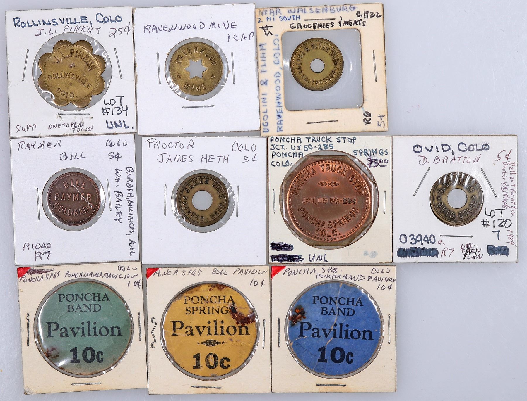 Lot of ten tokens from Colorado towns O, P & R: Ovid: D. Bratton; Poncha Springs: Poncha Band Pavilion (3 different colors), Poncha Truck Stop (octagonal); Proctor: James Heth; Raymer: Bill; Ravenwood (2): Ugolini & Fliam, Ravenwood Mine; Rollinsville: J. L. Pinkus.