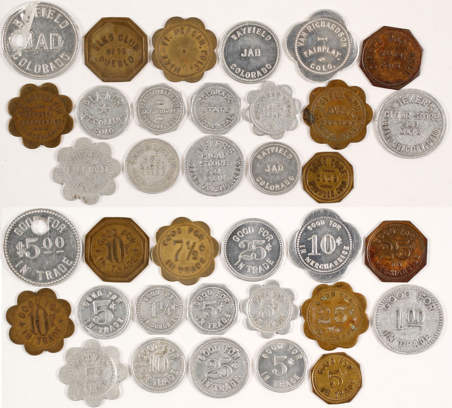 18 Colorado tokens. Van Richardson, PLA-MOR, Mack, Lovell and Lovell, Penrose Pharmacy, Elks Club, JE Hornbaker, Lone Cone Club, Circle Pool Hall, Ignacio Billiard Hall, JAD, Jad, Jad, Colorado State Hospital, Wiekels Cigar Store x2, CH Patterson, Owl Cigar Store State: Colorado City: Date: