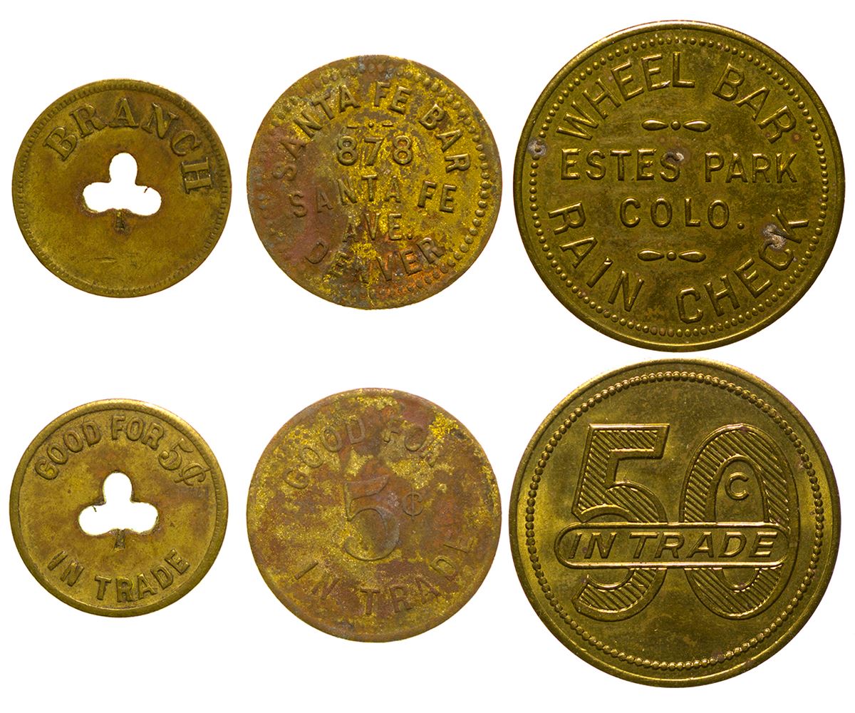 1) Cripple Creek, CO / Branch Saloon // GF 5c IT. Shamrock cut-out. 2) Estes Park, CO / Wheel Bar Rain Check // GF 50c IT. 3) Denver, CO / Santa Fe Bar // GF 5c IT. Very worn and mottled.