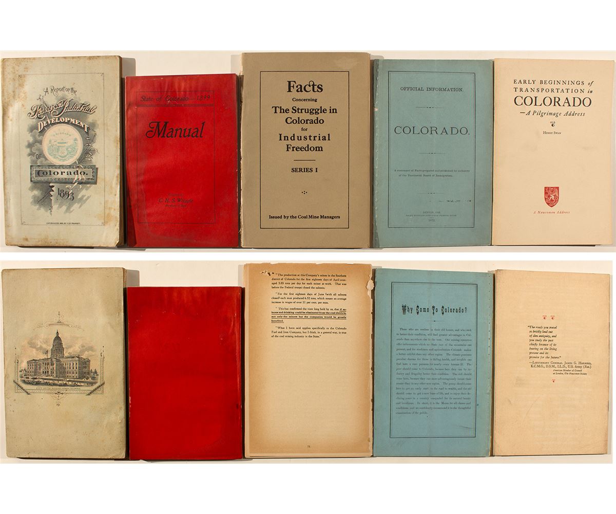 Lot of five: The real gem is 1) Official Information. Colorado. “A statement of Facts prepared and published by authority of the Territorial Board of Immigration.” Rocky Mountain News Steam Printing House. Denver, Colorado. 1872. Very rare. Blue softcovers. 35 pages. Previous owner punch stamp (The John Crerar Library). “Why come to Colorado? Those who are restless in their old homes, and who seek to better their condition, will find greater advantages in Colorado than anywhere else in the west. Our mining resources offer inducements which no State east of the mountains can present…In short, it is the Mecca for all classes and conditions, and we confidently recommend it to the thoughtful examination of the public.” 2) Facts concerning the Struggle in Colorado for Industrial Freedom, Series 1. Issued by the Coal Mine Managers.1914. 72 pages. 3) 1899 State of Colorado Manual. By C. H. S. Whipple, Secretary of State. 159 pages. 4) A Report on the Resources and Industrial Development of Colorado. 1893. By C.S. Faurot. 196 pages with index. Foxing. 5) Early Beginnings of Transportation in Colorado, A Pilgrimage by Henry Swan. 1944. 40 pages.