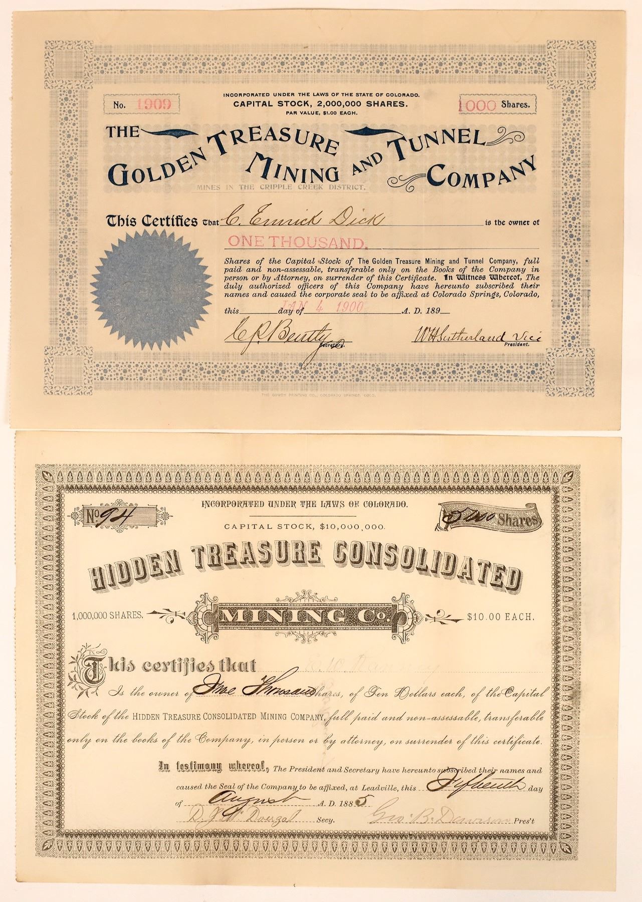 Lot of two different. 1) Hidden Treasure Consolidated Mining Company. No. 94, issued for 5,000 shares to EW Ramsey in 1885 in Leadville. Signed by president Geo. B. Davison and secretary Dougal. Not cancelled. Black border and print. 8 x 10.25" Folds, creases, toning. We believe this to be a Leadville mine. C&L list 18 "Hidden Treasure" mines in Colorado in 1883. Scarce Leadville stock; we have no previous sales records for it. 2) Golden Treasure Mining & Tunnel Company. "Mines in the Cripple Creek District" (printed under title). No. 1909, issued for 1,000 shares to C. Dick in 1900. Signed by vice president Sutherland and the secretary. Not cancelled. Blue border and seal. Folds, creases. 7 x 10.25" According to Hills, they owned the Chicago and Clipper on Howell Hill and the Little Clayton on Bull Hill.