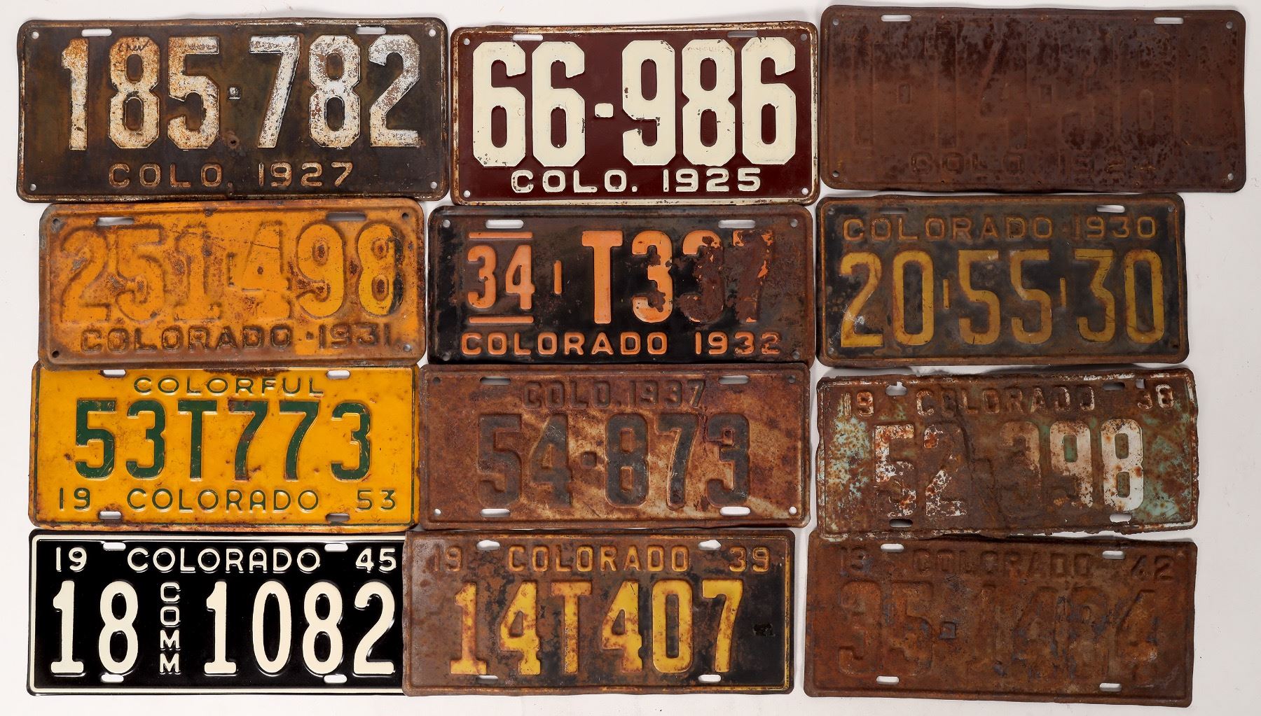 12 Colorado License plates, c. 1924-53. Condition varies, some may be dug. Colorado Bracken Estate