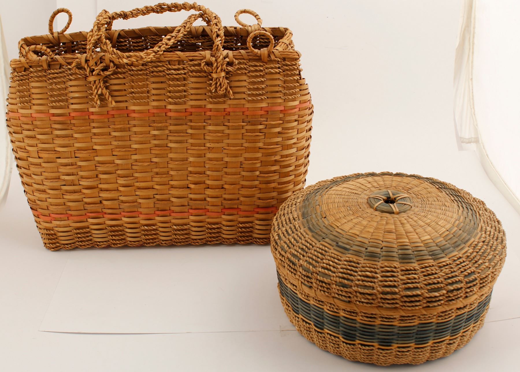 1) Vintage Northeastern bi-colored splint ash and sweetgrass Micmac lidded sewing basket. Lid is a bit faded. 5" high x 10" diameter. Very good condition. 2) Antique bi-colored splint ash and sweetgrass two-handled carrier basket. 10.25" high x 14" wide, 5" deep. Also very good condition. Another great pair.
