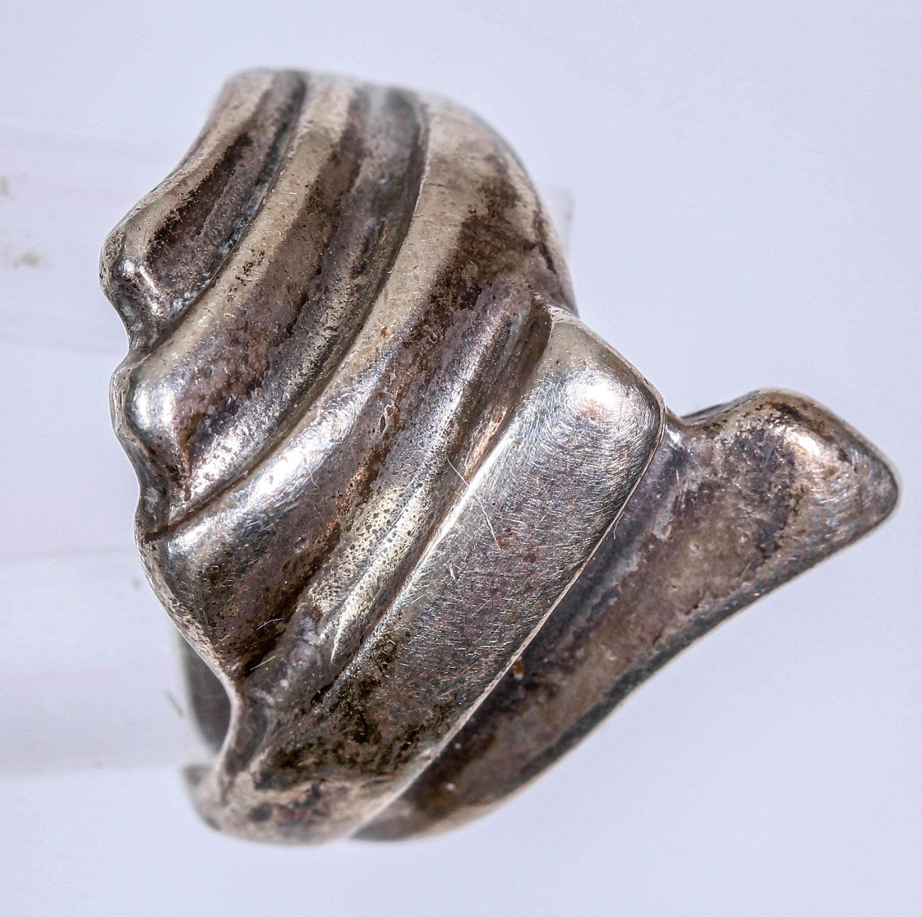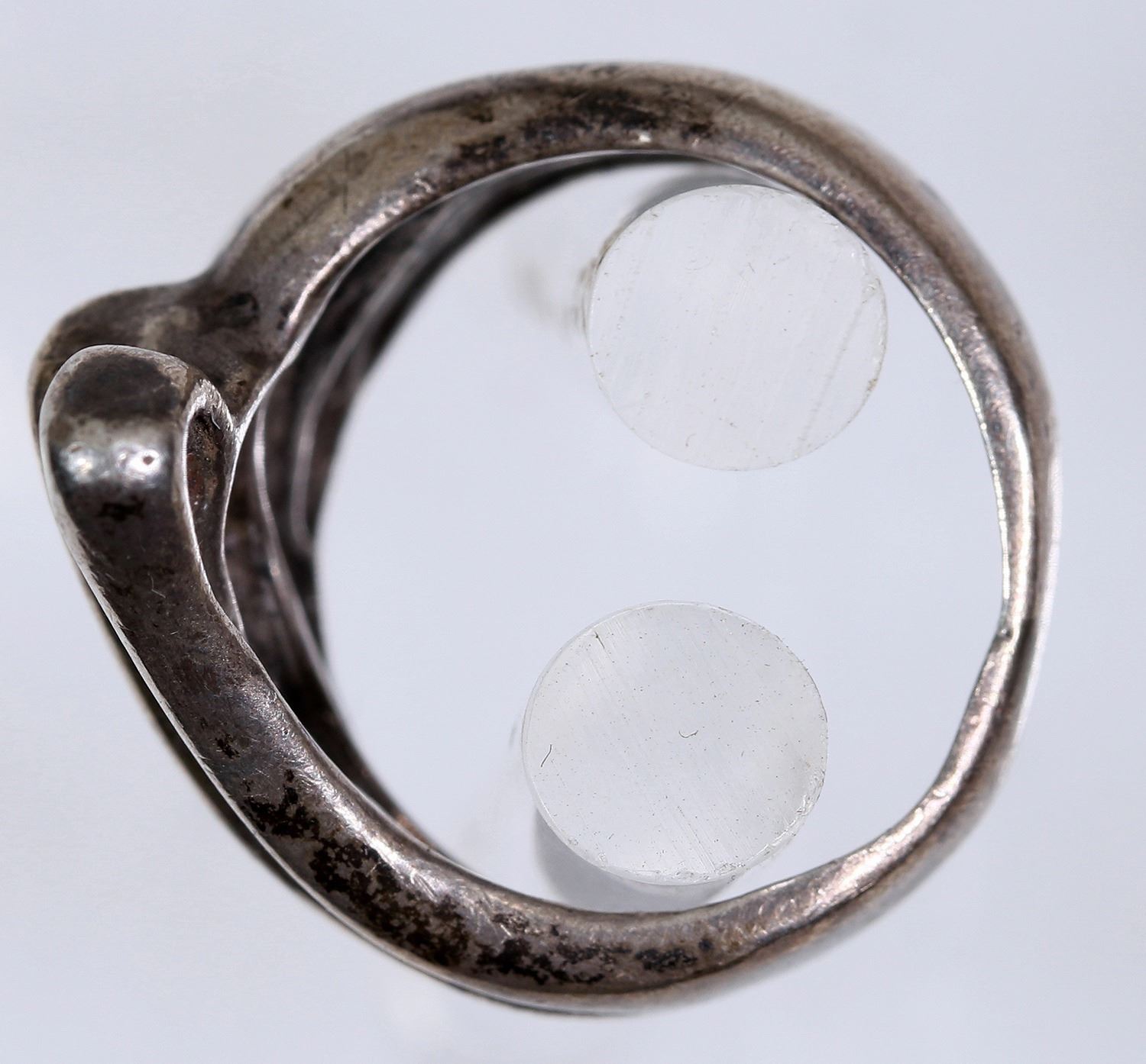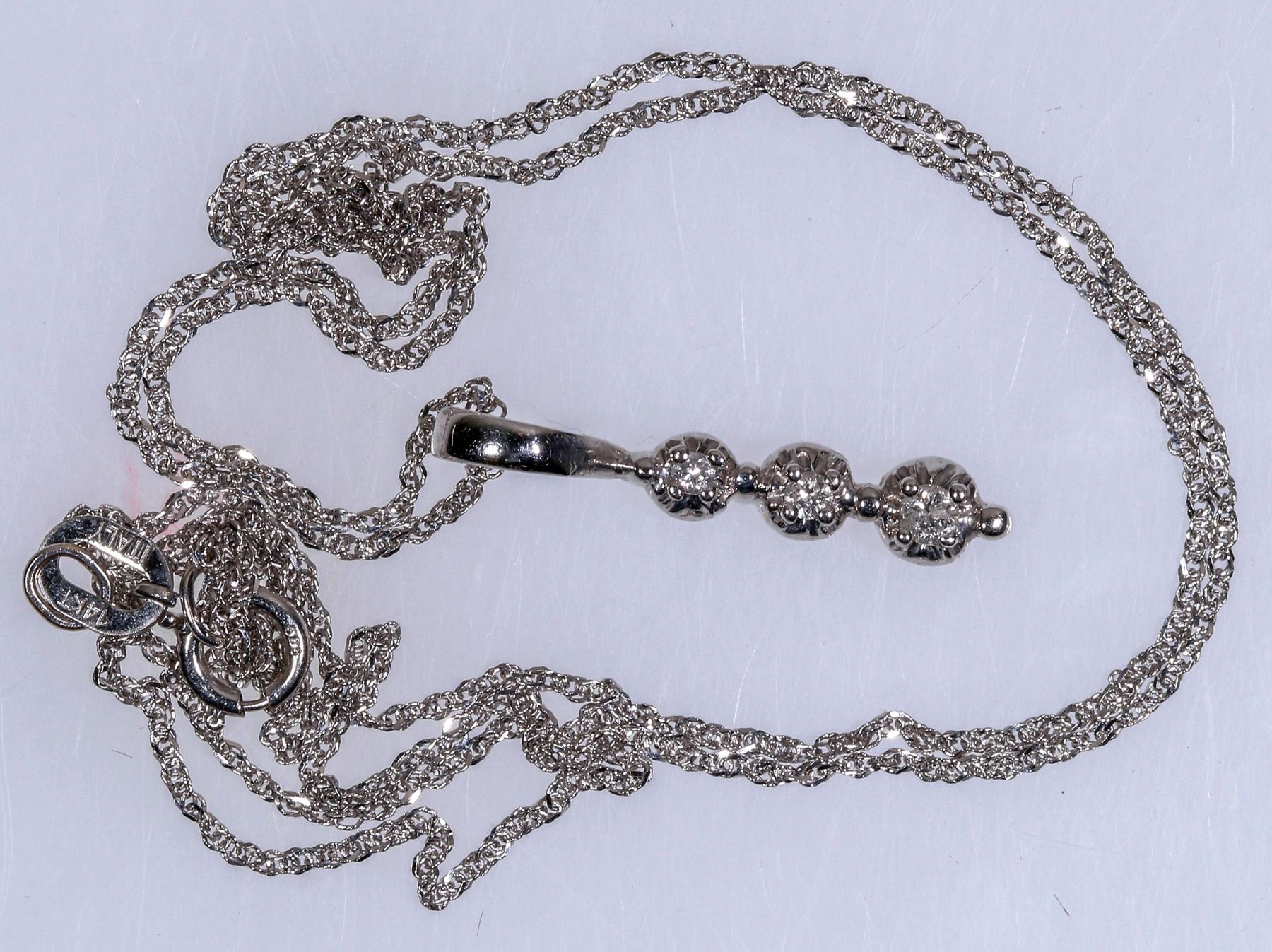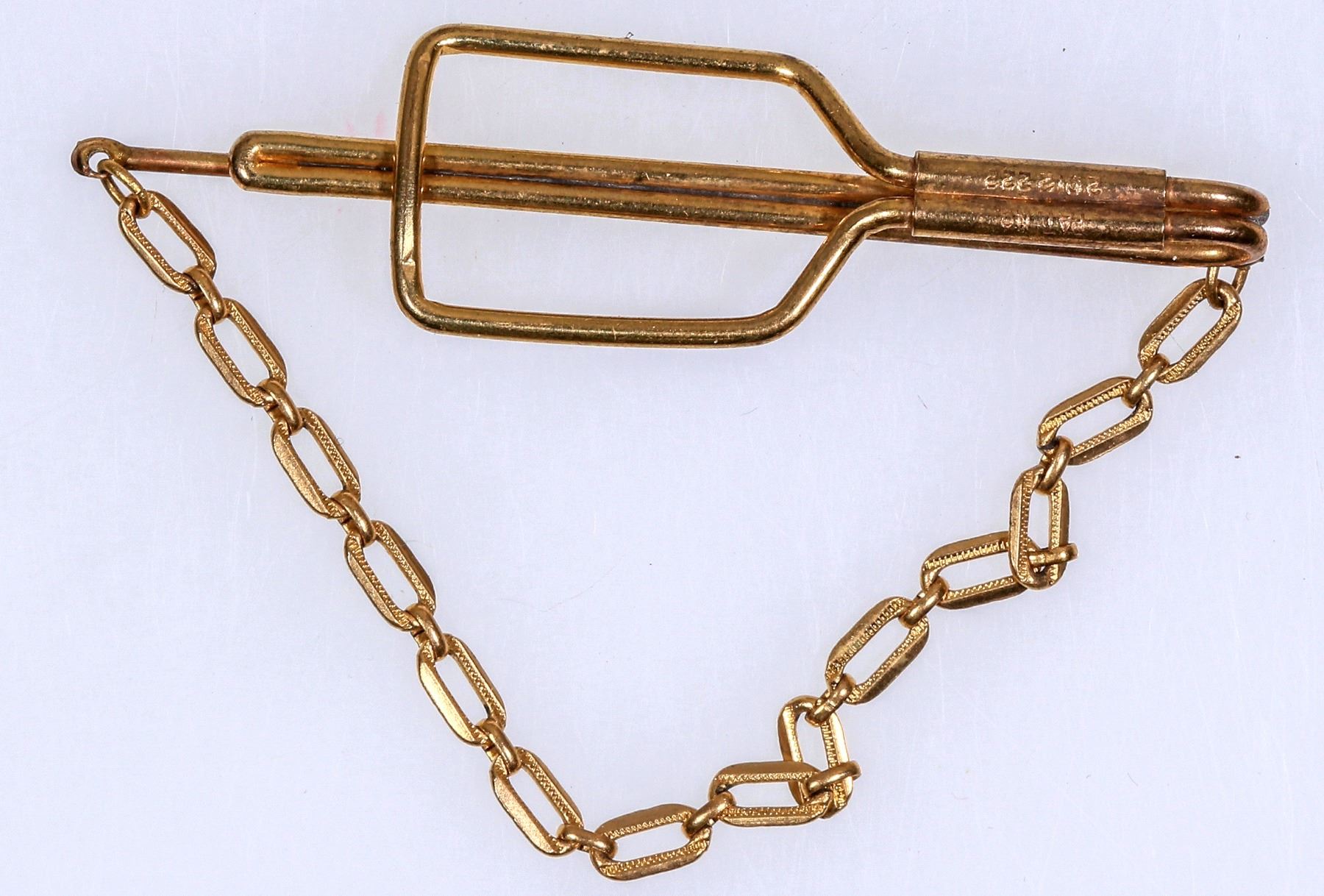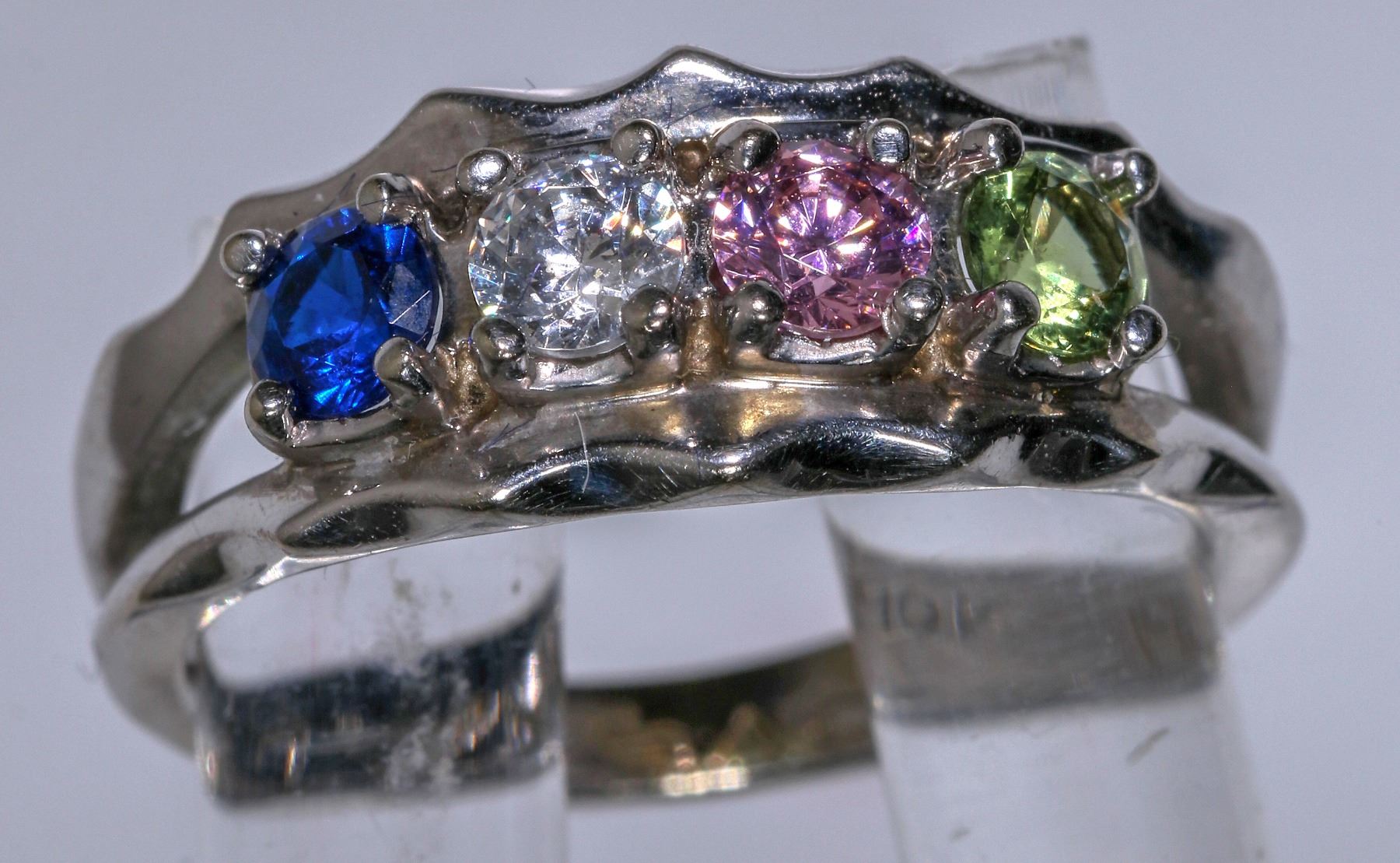 Four pieces of jewelry. 1) Four stone ring (green, pink, white and blue) inscribed "Love Jake", marked 10 Kt. 2) overlapping bands of white metal, appears to be silver but no markings. 3) white metal necklace with three small diamonds. 4) gold toned tie tack with patent number.