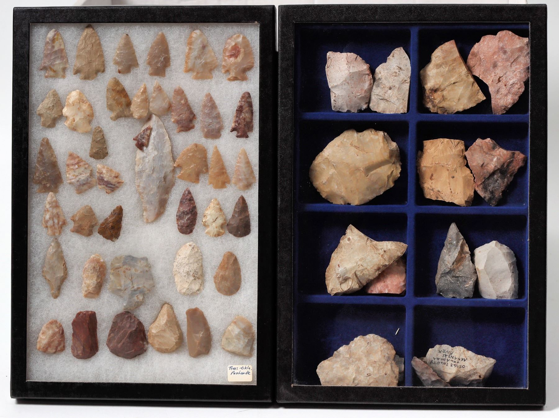 This collection is over 60 projectile points from Oklahoma and the Texas Panhandle area. Two Riker boxes are of projectile points and a third box is of tools. Sizes range from .75 in./ 18 mm to 3.5 in./ 89 mm. From the Gary Bracken collection. Please see photos for details. State: Oklahoma, Provenance: Gary Bracken Collection. Note: per advice from various bidders, not all may be Alibates . . . you make the decision.