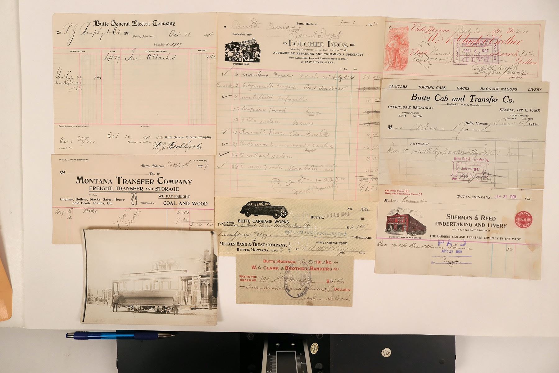 Great lot of paper from early Butte. Billheads include Sherman & Reed Undertaking And Livery, 1905;Montana Transfer Company, 1904; Butte Cab and Transfer Co. 1912; Butte General Electric Company, 1894; Boucher Bros.- Trimming Dept. of the Butte Carriage Works, 1936; and a nice photo of an electric streetcar in Butte circa 1905. Also, two checks from W.A. Clark & Brother, Bankers and one from Butte Carriage Works.