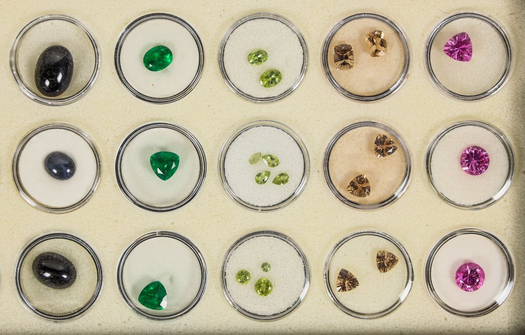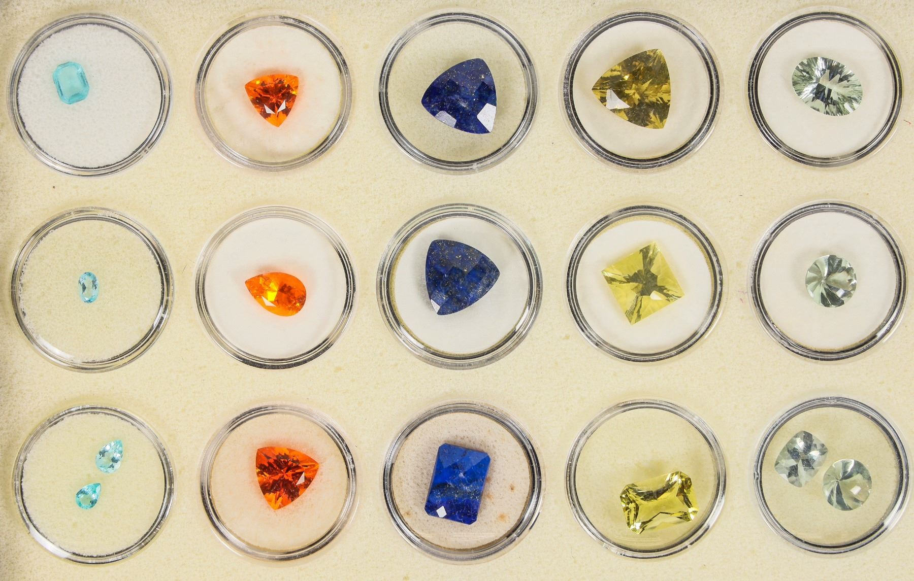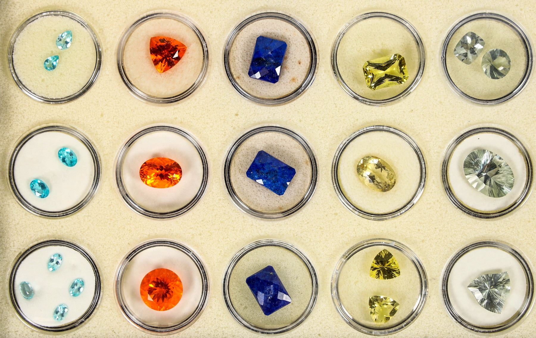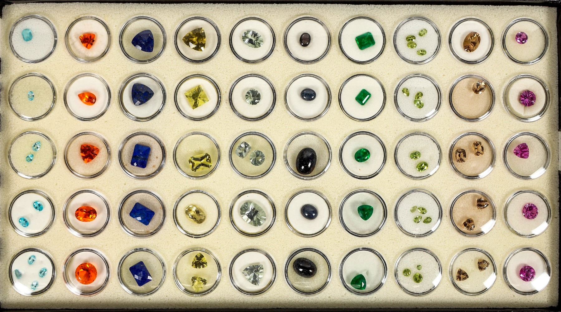 Fine Collection of 10 different faceted gemstones with a quantity of 5 each in 1" circular gem holders. About 71 stones overall. Outstanding variety includes pink sapphire, champagne quartz, apatite, French crackled quartz, black star sapphire, prasiolite, lemon quartz, lapis, Mandarine, and Brazilian apatite. Generally 5mm up to 1.5cm. Numerous different faceted shapes and hues.