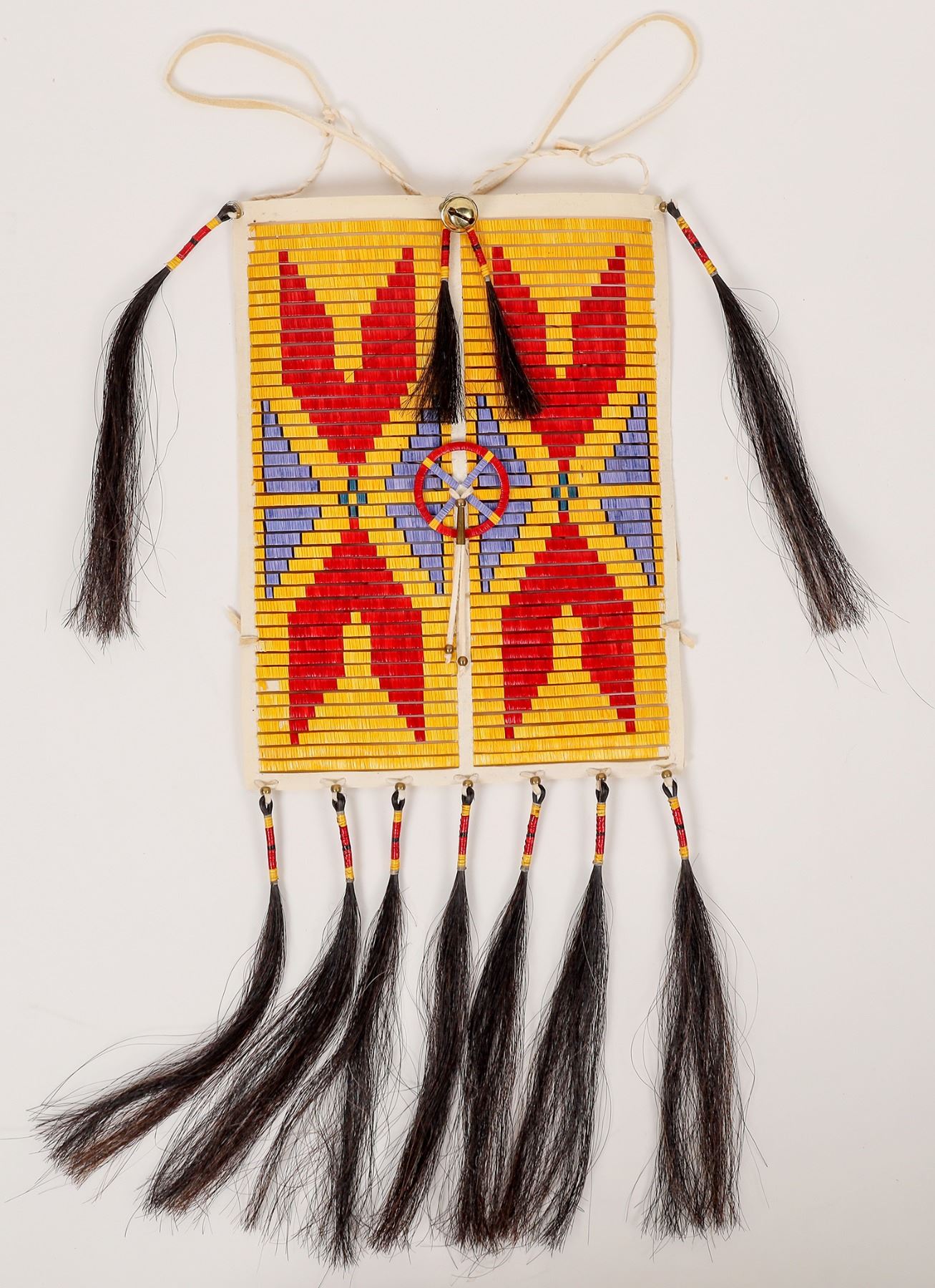 Fancy colorful porcupine quill breast plate with horsehair tassels. Red, violet, yellow and white. Brass bell at top center. The colors really pop! 24x10".