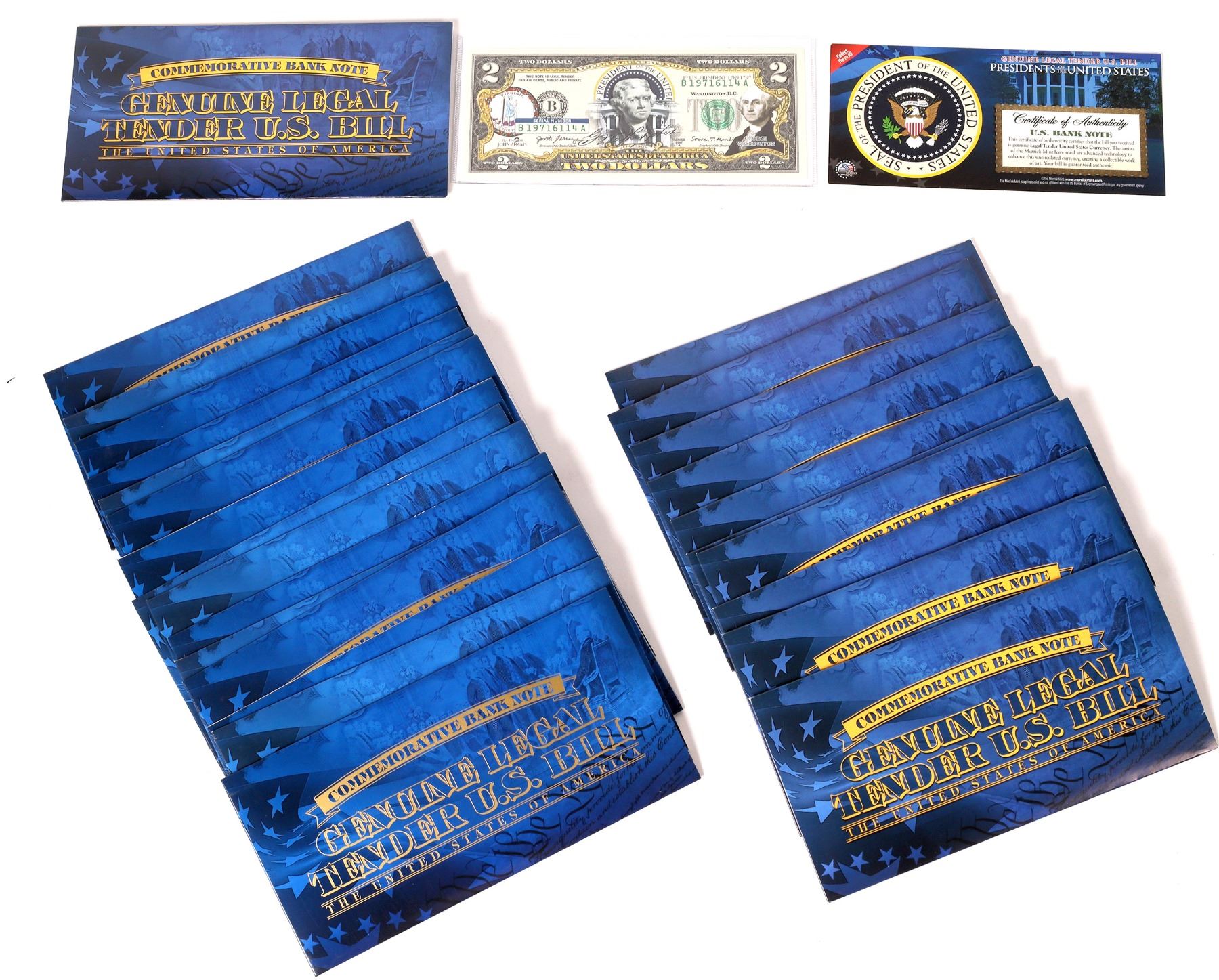 Issued by the Merrick Mint, 26 crisp uncirculated genuine legal tender $1 & 2 U. S. Bills, artistically enhanced to commemorate historic events. Ten one dollar notes; sixteen two dollar notes. Sold online for $11.95-$15.95 each.