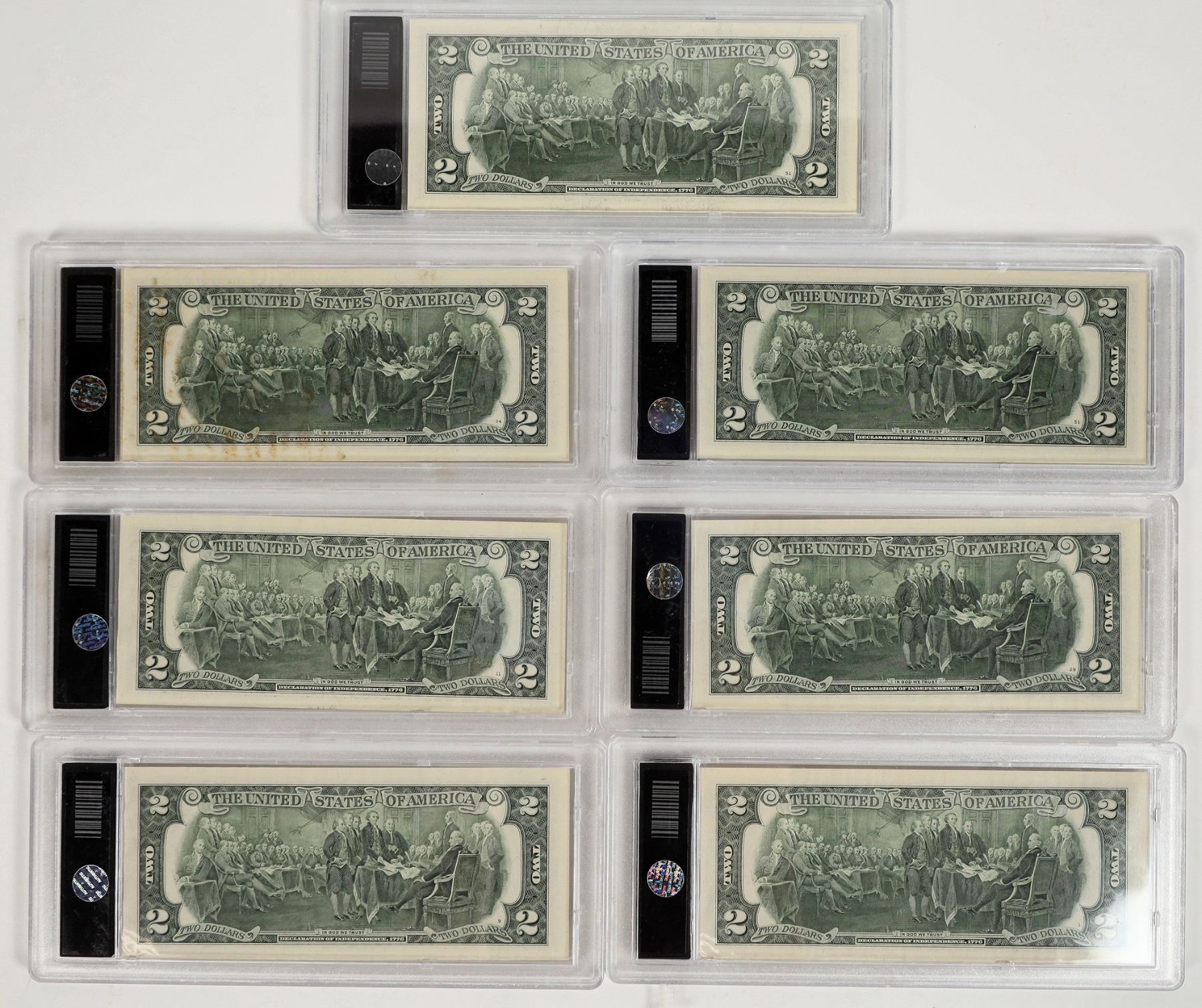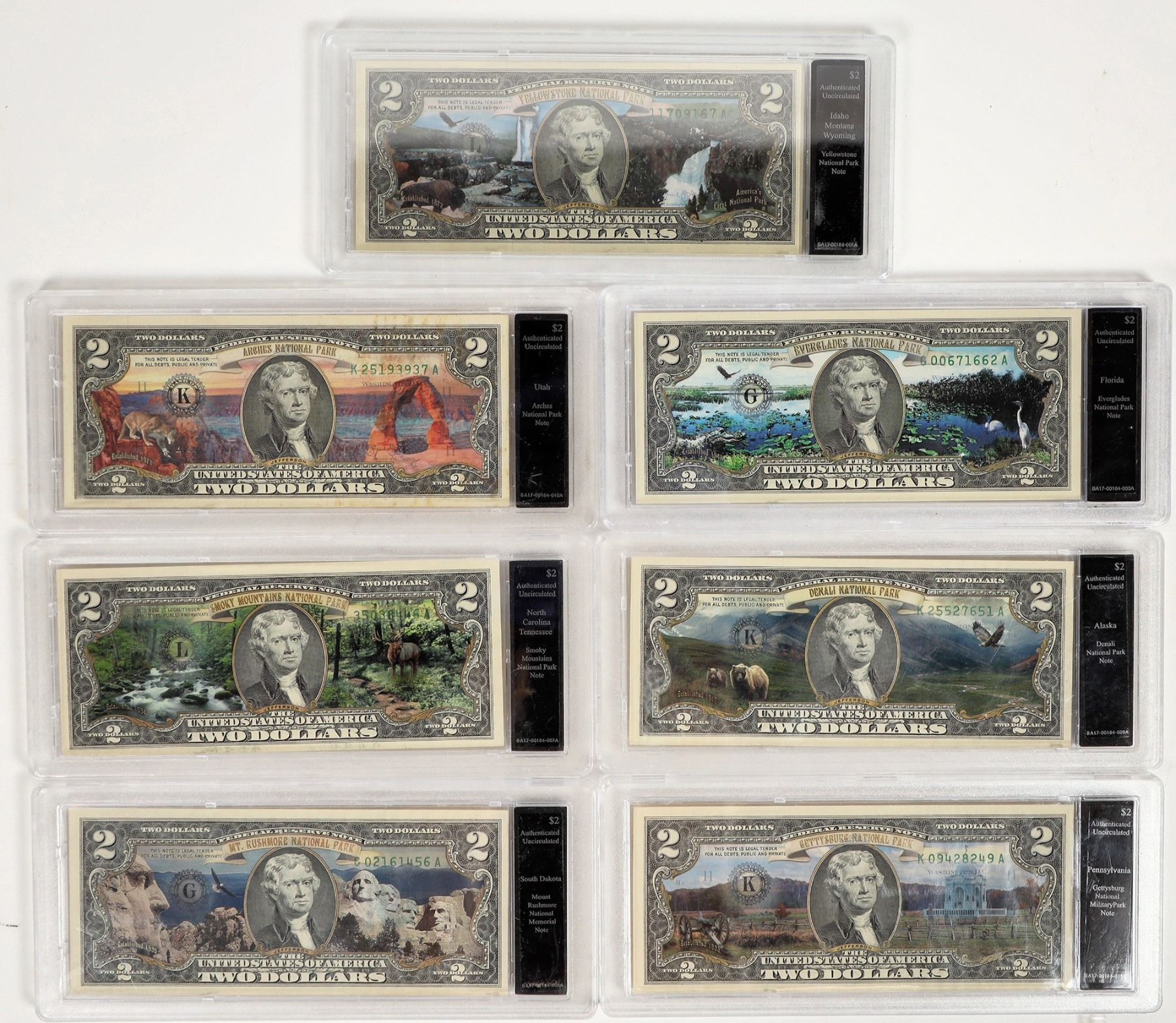 National Parks are celebrated on these seven uncirculated two dollar bills with colorful background in hard plastic cases: Florida (Everglades); Utah (Arches); North Carolina/Tennessee (Smoky Mountains); Idaho/Montana/Wyoming (Yellowstone); Pennsylvania (Gettysburg); Alaska (Denali); South Dakota (Mount Rushmore). We believe these were issued by The Bradford Exchange.