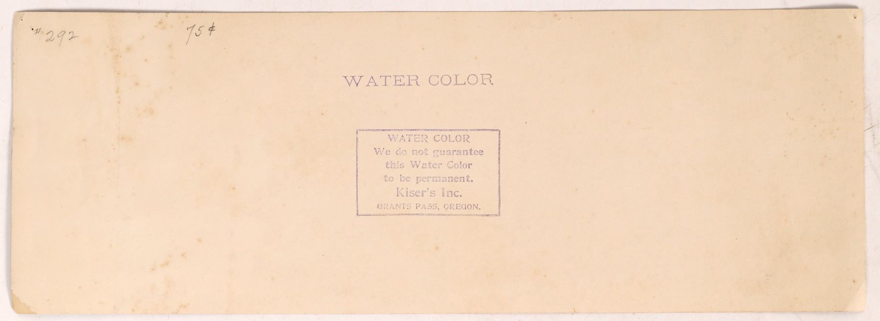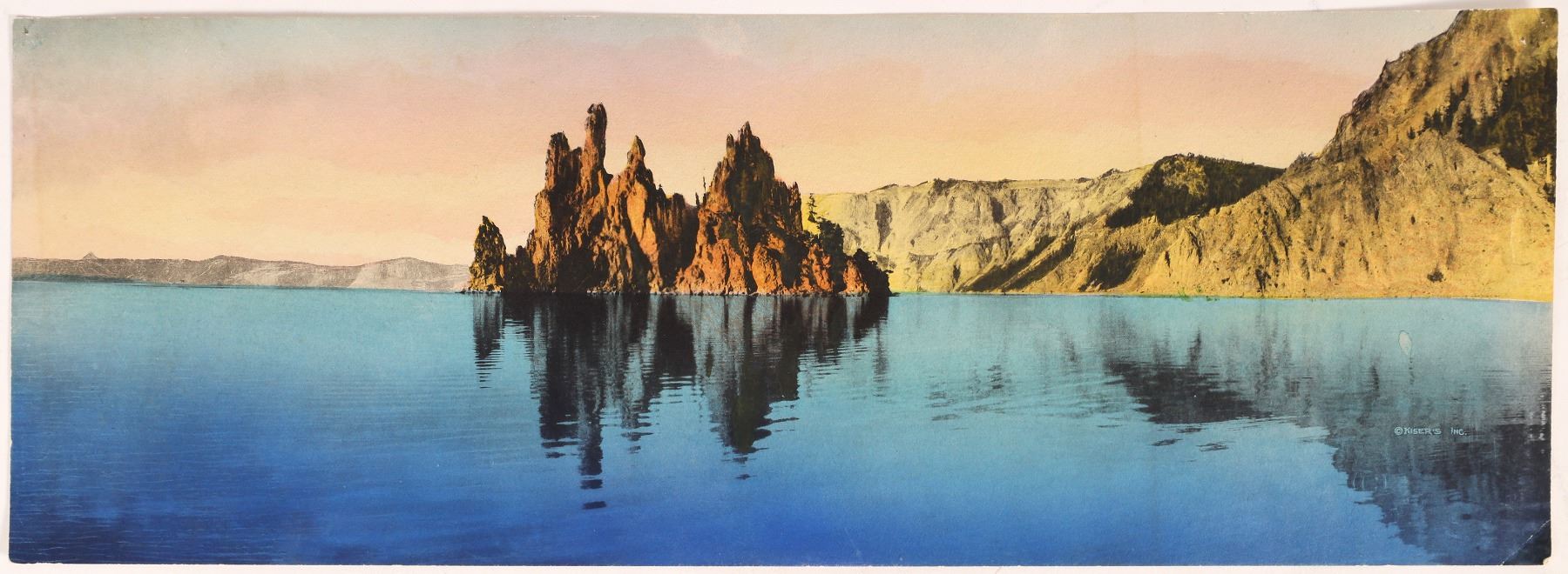 Watercolor created by Kiser's of Grants Pass, Oregon. 14 x 5 inch panorama of Phantom Ship Island in Crater Lake. Oregon