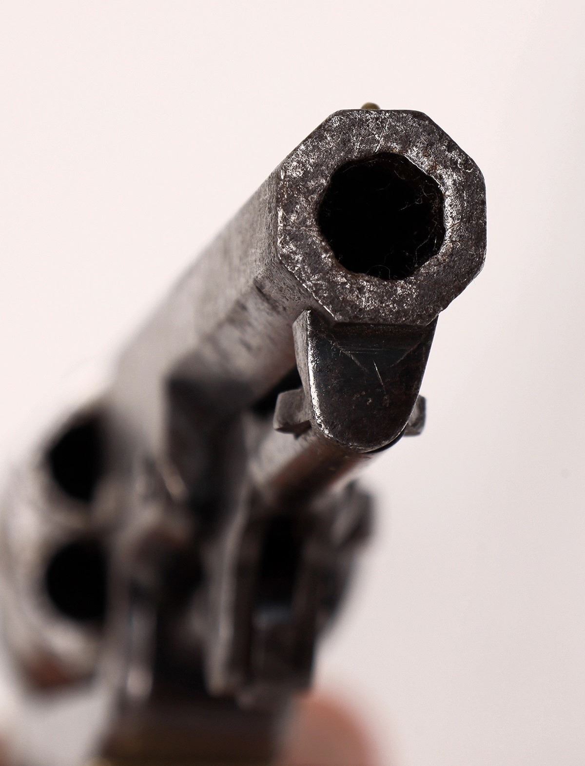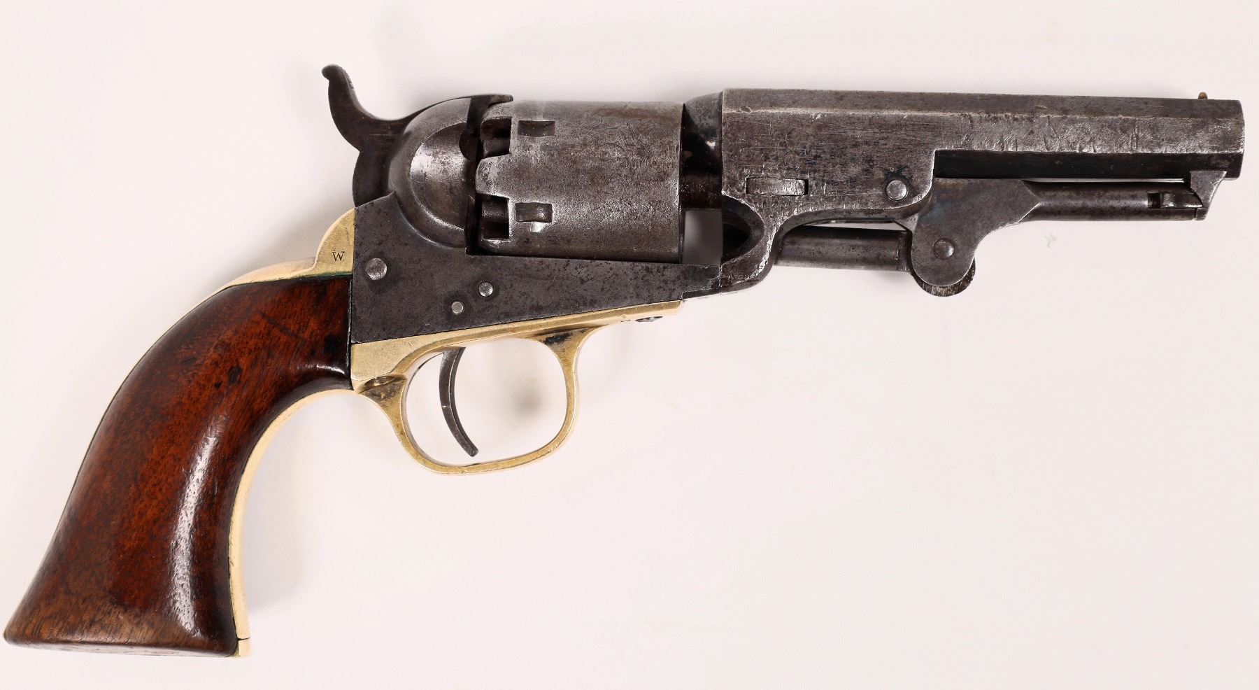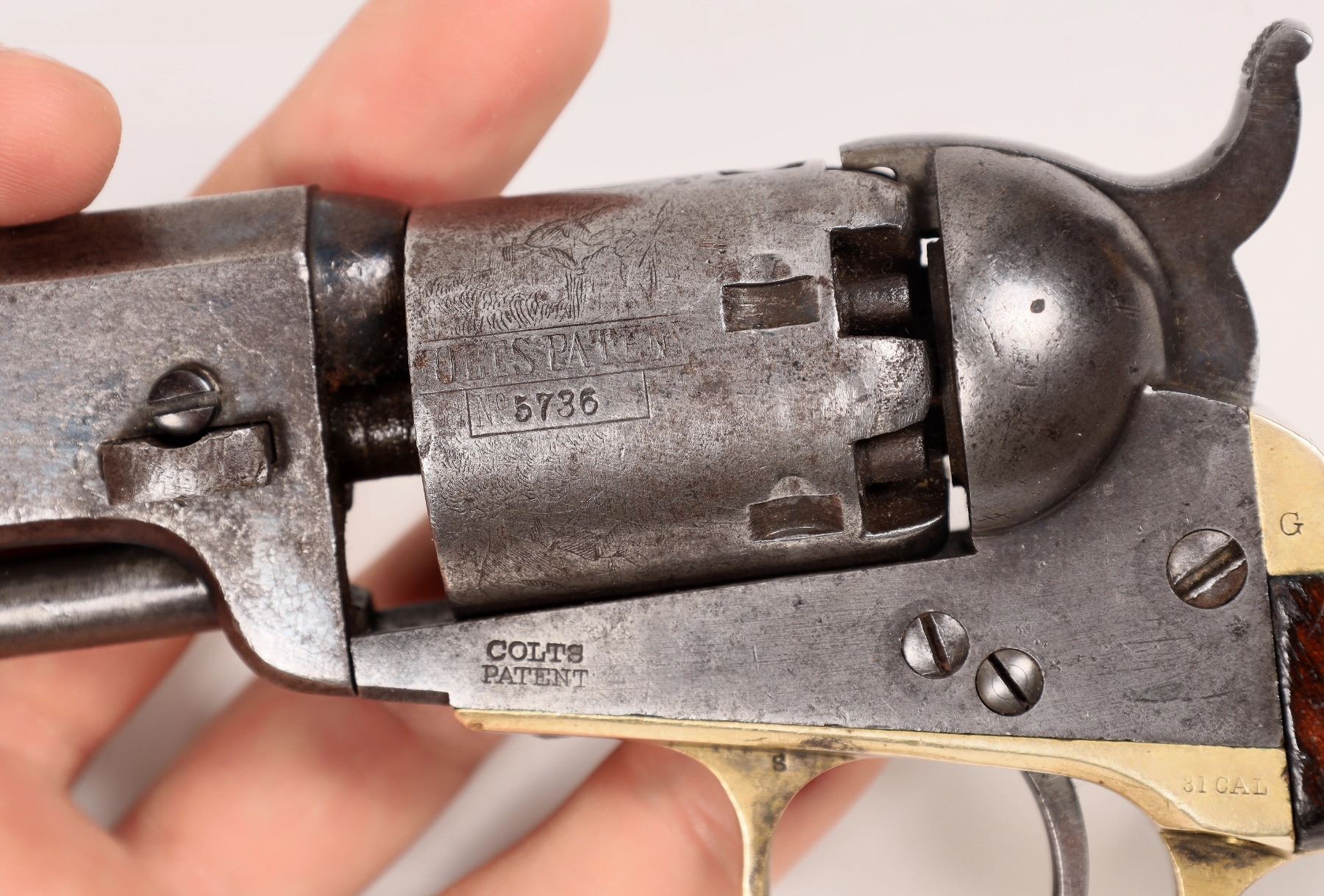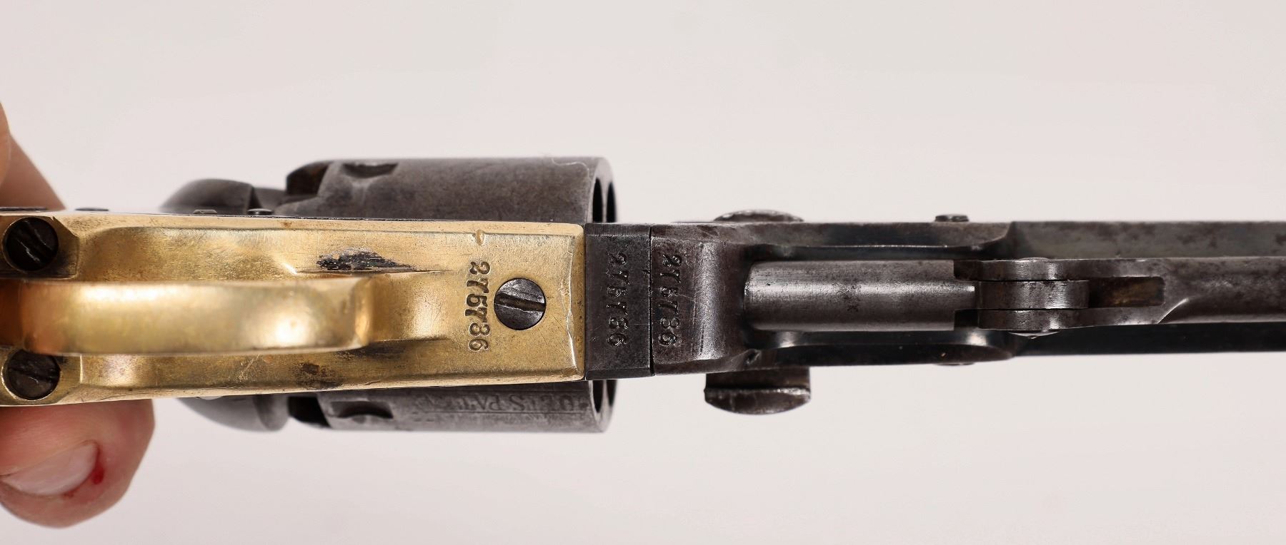 This little Colt is the model 1849 Pocket pistol in .31 cal. 6 shot, S/N 275736 with a 4 in. barrel. The serial number indicates a birthdate of 1866. ALL NUMBERS MATCHING INCLUDING THE WEDGE. The stagecoach robbery scene on the cylinder is still visible, original varnish on the single piece walnut grips. The bore is dusty but rifling is intact without any pits. The cylinder clearance to the barrel is still within tolerance of a near new gun! All serial numbers are stacked on the bottom of the gun: barrel, frame, trigger guard, and backstrap. Interestingly, there are four sub-inspector marks on the gun: "G" on the left ear of the backstrap, a "W" on the right ear of the backstrap, a "K" on the bottom of the grip frame forward of the mounting screw and an "S" on the left side forward of the trigger bow. Further research would be needed as to why this gun is so heavily marked. These little pocket pistols were never military issued guns; however, it was one of the most popular carried guns by individuals throughout the war purchased in the commercial market. The popularity of these Pocket model guns lead Colt production for 10,000 units per year until the conflict between the states. During the conflict production increased to 20,000 units per year making this gun model the most produced Colt ever made. There is about 20% original bluing on the bottom flat of the barrel and frame. The Colt's Patent is stamped on the left forward edge of the frame, and the barrel address reads "ADDRESS COL SAML COLT NEW-YORK AMERICA" without any arrows before or after. The overall appearance shows handling marks of a 150 year old gun with little wear to the mechanism. This gun is an antique and no attempt has been made to fire this gun to confirm its mechanical integrity. Nor should this gun be fired without the examination by a qualified gunsmith. Any attempt to fire an antique gun is at the risk of the owner and not consistent with the value of the firearm. No sales to New York, New Jersey, California, and Hawaii. This is an antique, non FFL firearm. Overall length is 7 in. Please see photo for details.