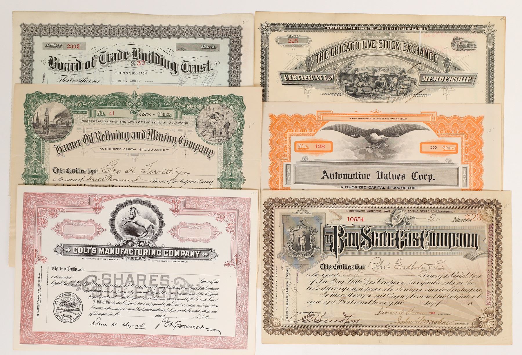 Stock certificates issued by Colt's Manufacturing Company, Hamner Oil Refining & Mining Company, Automotive Values Corp, Board of Trade Building Trust, The Chicago Live Stock Exchange and Ball State Gas Company. Please see photos for more detail. 1900s