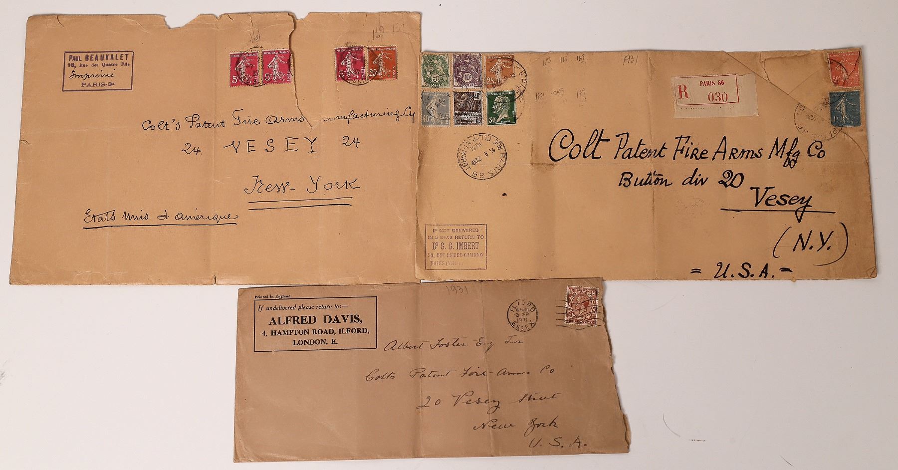 This lot contains three envelopes addressed to the Colt Patent Firearms Mfg. Col. of 24 Vesey St,, New York, New York; the N.Y. field address used in 1931. Two letters from Paris and one from London, with postage stamps.