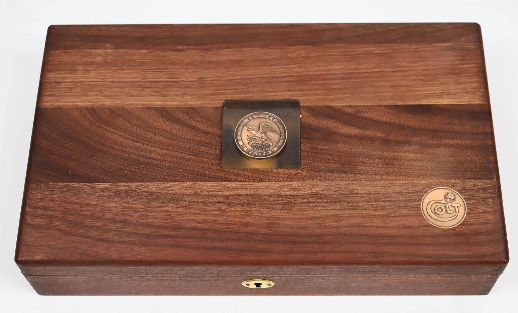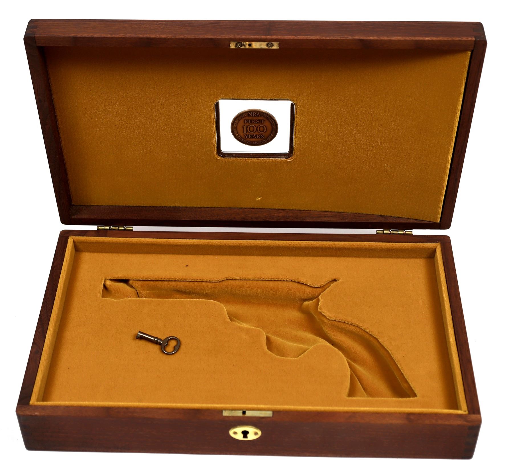This display case has the NRA medallion for the centennial 1871-1971 top center with the Colt medallion in the front right center. It is lined with a gold velvet fabric and the case fits a Colt Single Action Army with a 4.75 in. barrel. Like new condition. 14in. X 8 in. X 3in.
