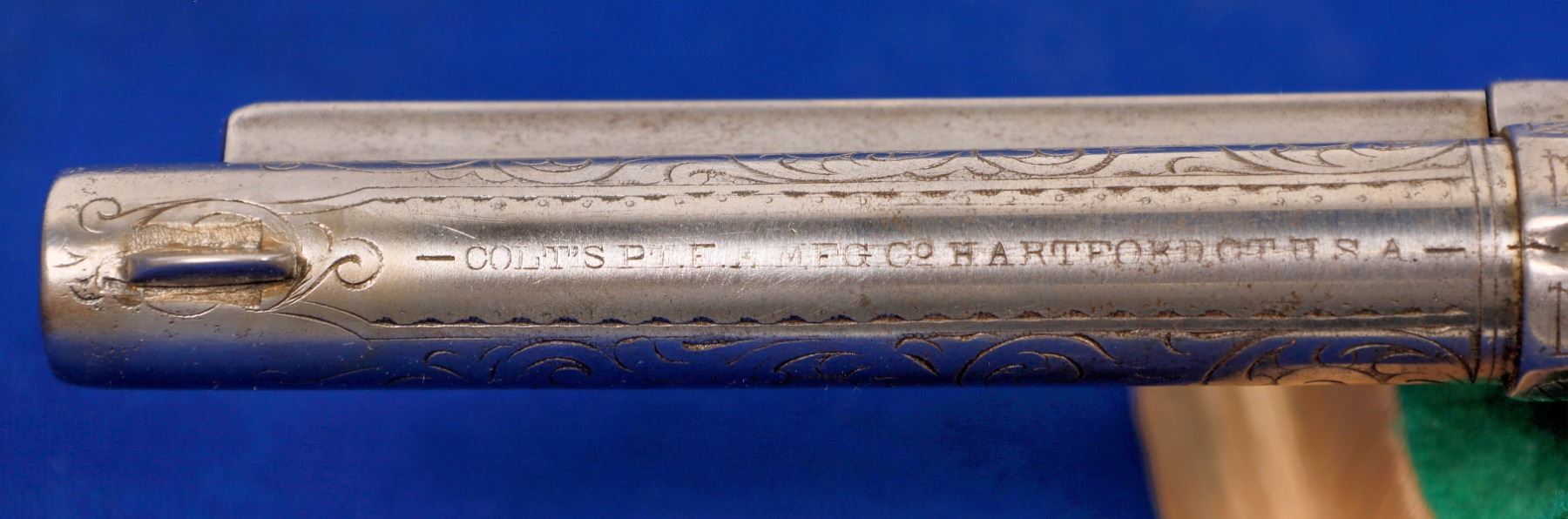This is an engraved Colt SAA S/N 24547 built in 1876; all numbers matching. It has been engraved by the notable Colt engraver Louis Daniel Nimschke. It has a barrel length of 5 1/2 in.; shortened from it's original length of 7 1/2 in. (Reference appraisal by Charles Layson). It is thought that this revolver was engraved while Nimschke worked out of the New York offices, possibly Schuyler, Hartley & Graham or B. Kittredge & Son of Cincinnati, Oh. It was common to take a revolver that was not sold and have it engraved to enhance its value and desirability. (Reference Nimschke engraving in "Colt An American Legend" by R.L. Wilson p. 108). Nimschke also engraved two other guns in the same serial range, notably #23451 and #26006. Unlike some collectable Colts that were never used; this "working" gun shows wear to the engraving. One can only speculate as to whom this owner was; a law dawg or rancher perhaps. The gun is chambered for .45 Colt and wears two-piece fully checkered grips. The barrel wears a dovetailed front sight that confirms that the barrel has been shortened. This practice was quite common in the 1880s for lawmen that wanted a quick pointing gun and later developed by the Colt factory by issuing the Sheriff's model gun without an ejector. While no factory letter exists for this gun, Colt Historian Beverly Haynes describes the gun to be built in 1876, chambered in .45 Colt and with a 7 1/2 in. barrel. The frame wears a two date patent cartouche supporting the early manufacture. These features support that L.D. Nimschke engraved this gun: star motifs on the sides of the frame; cross-hatching above stars, on rear of trigger guard, and under the loading gate; double line border at rear of barrel; straight line border around frame enclosing the foliage; heavy, bold counter-clockwise scrolls, with small interior scrolls and tentacles on the outside. (Reference appraisal by Charles Layson). The bold scrolls intersect the hammer screw at the same location as in other Nimschke engraved firearms of the period (KAW). 2020 Appraisal included with this sale. This gun is an antique and no attempt has been made to fire this gun to confirm its mechanical integrity. Nor should this gun be fired without the examination by a qualified gunsmith. Any attempt to fire an antique gun is at the risk of the owner and not consistent with the value of the firearm.