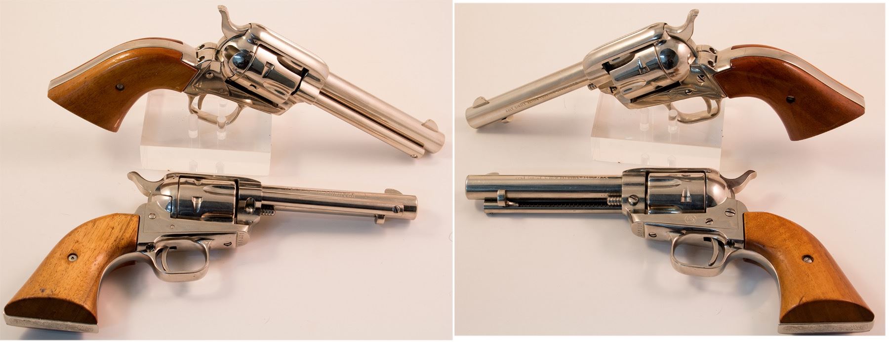 Colt 2nd generation 22 caliber single action Armys that were made in 1961 and are only 55 serial numbers apart. Both arms are original nickel with nice aged wood grips. Both have matching factory scroll engraving on the butt of the back strap. One arm has the name ‘Jack w Slaughter’ professionally embossed on the right side of the barrel. Both arms function well and would look great in a display or a double gun rig for Cowboy Action Shooting. Excellent and hard to come by 2nd generation 22 LR Colt’s. FFL or C&R Require. Not transferrable to all municipalities. State: City: Date: ID# 42734