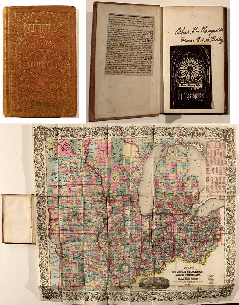Traveler and Tourist's Guide-Book through the Western States and Territories containing brief descriptions of each, with routes and distances on the great liens of travel...By J. Calvin Smith. Published by J.H. Colton. 180 pages plus map. 100 pages with 30 ;pages of other items for sale. Map is 20" x 24.75." Titled "Guide Through Ohio, Michigan, Indiana, Illinois, Missouri, Wisconsin & Iowa." Map is very colorful and in very good condition with a few tears at fold lines. This book belonged to Charles Reynolds and was given to him by Edward Bailey.