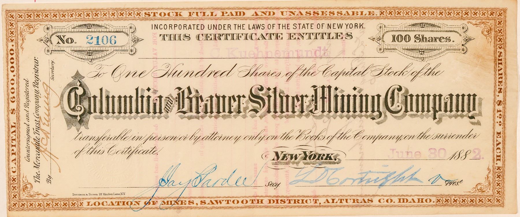 Location of Mines: Sawtooth District, Alturas County, Idaho (printed at bottom center). Inc. in New York. No. 2106, issued for 100 shares to C. Kuehnemundt on June 30th, 1882. Signed by vice-president Cortright and secretary Pardee. Not Cancelled. Brown border, black print. Many pinholes, folds, some soiling. 4 x 9.25" According to E&MJ Vol. 34, the company owned the Columbia, Beaver, Little Frankie, and Lucky Boy mines. The Columbia has 4 tunnels; the Beaver has one tunnel and 8 men; and the Lucky Boy is very promising (1882, pg. 74). Ken Prag Collection