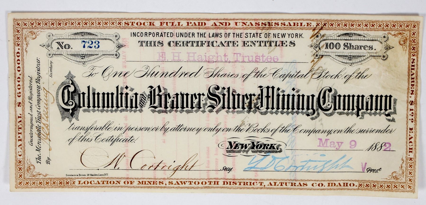 Location of Mines: Sawtooth District, Alturas County, Idaho (printed at bottom center). Inc. in New York. No. 723, issued for 100 shares to EH Haight in 1882. Signed by vice-president Cortright and secretary Cortright. Not Cancelled. Brown border, black print. Many pinholes, folds, some soiling. 4 x 9.25" According to E&MJ Vol. 34, the company owned the Columbia, Beaver, Little Frankie, and Lucky Boy mines. The Columbia has 4 tunnels "all in good ore" containing quartz, black sulphurets, ruby, and native silver; the Beaver has one tunnel and 8 men; and the Lucky Boy is very promising (1882, pg. 74).