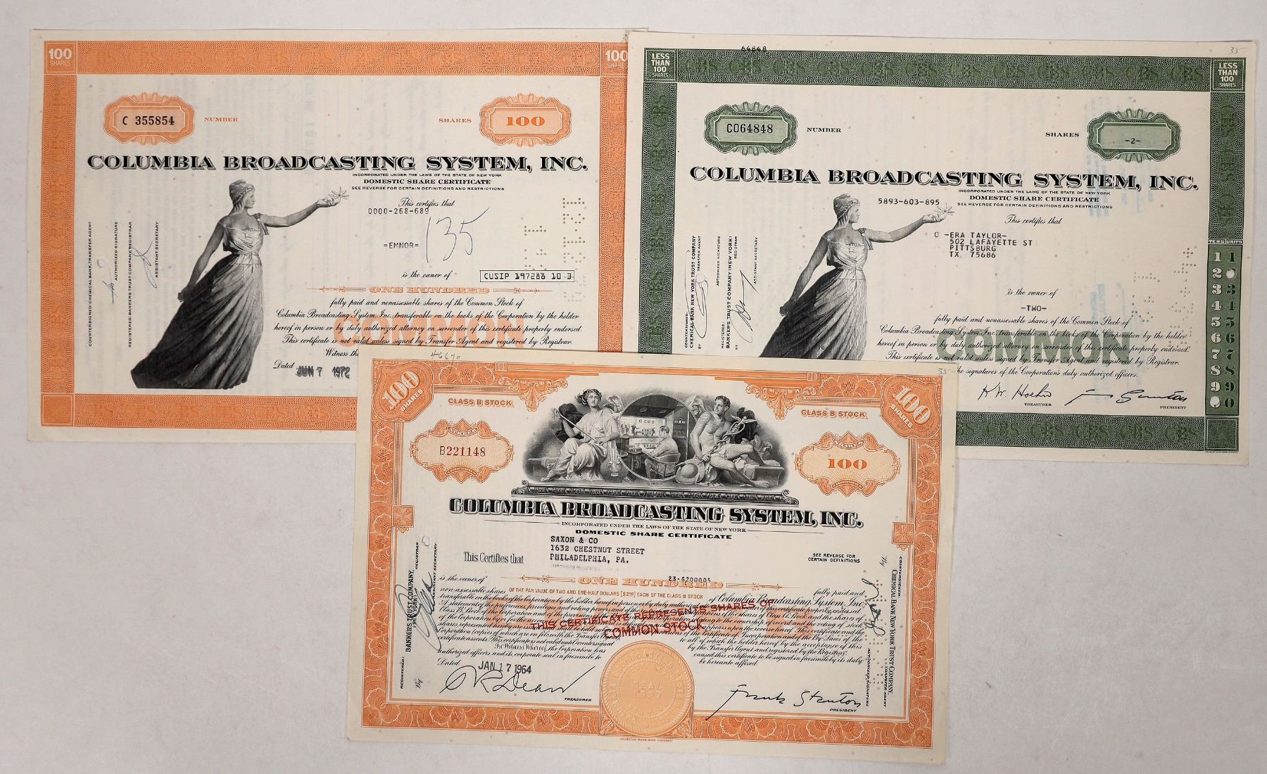 Issued 1964, 1967 and 1972 Columbia Broadcasting System stocks.