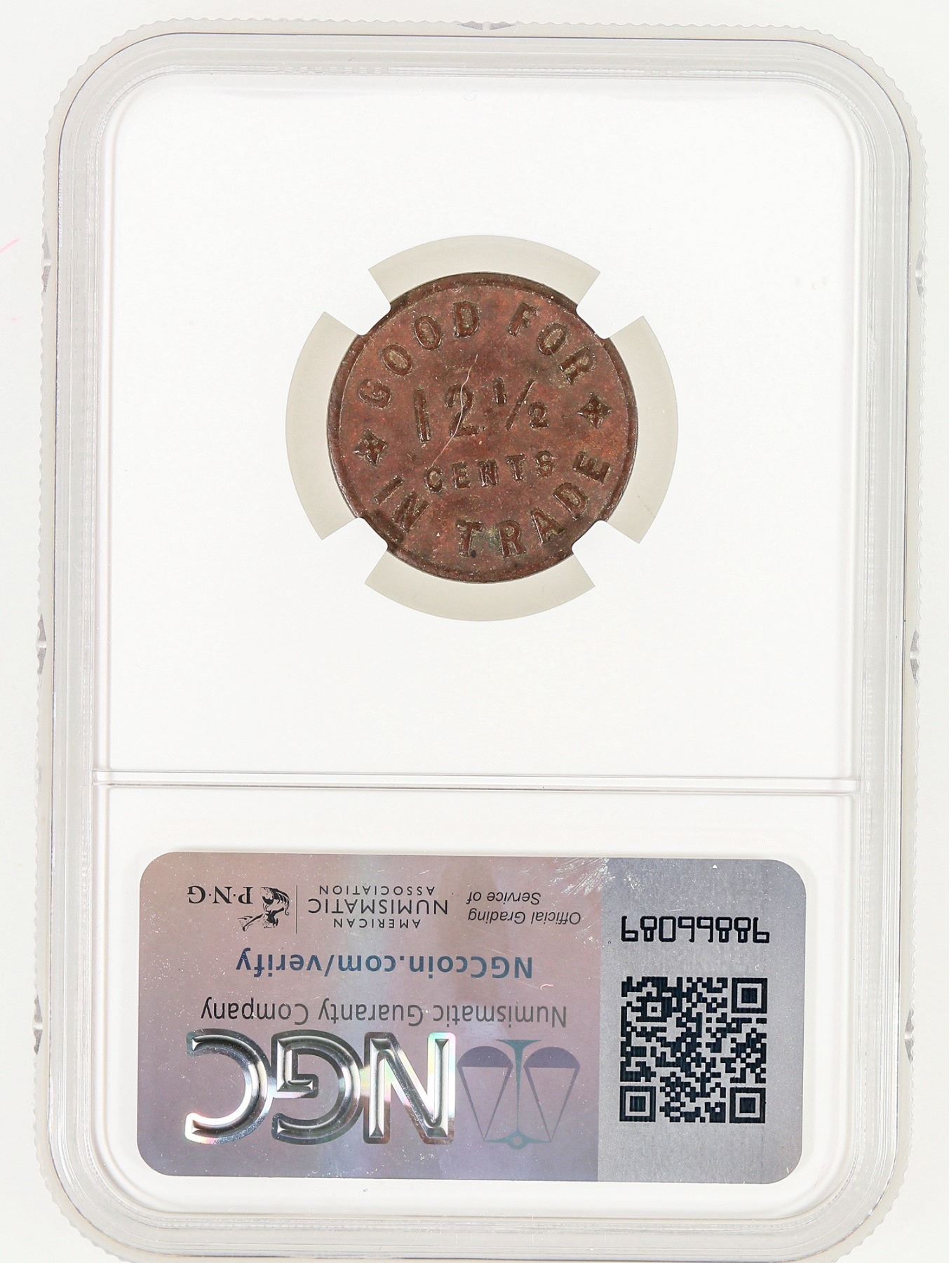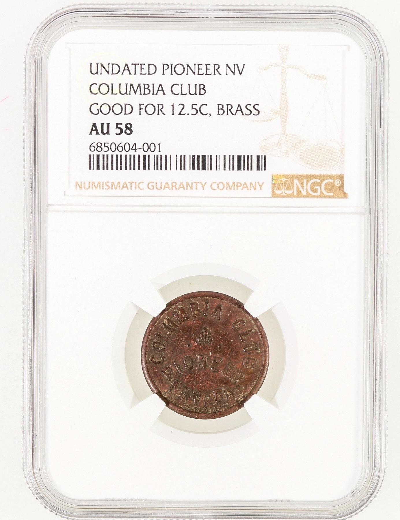 Perhaps the finest known. NGC graded AU 58. COLUMBIA CLUB / PIONEER, / NEVADA / L.A. RUB. STAMP CO. // GOOD FOR / 12¬Ω / CENTS / IN TRADE; Br., rd, 21 mm.
