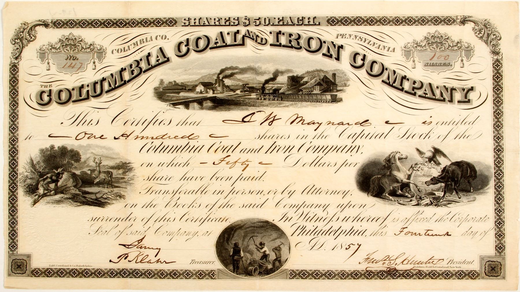 # 147 for 100 shares to JN Maynard. Signed by Klahr(?) and president Fred S Huntul(?). Dateline Philadelphia 1857. Located at Columbia County, Pennsylvania. Four vignettes: Native American hunting, underground mining, seal and coal train by smelter. Bald, Consland & Co. printer. Not cancelled. Three vertical folds and three small pinholes where ink has eaten through the paper. Very nice! The coal deposits on McCauley Mountain were discovered as early as 1826. A large number of mining operations were carried out on the mountain during the 1800s. The McCauley Railroad Company was incorporated on May 5, 1854 and was built in 1855 and 1856. The company's railroad ran 5 miles from the Catawissa Railroad to the coal fields on the mountain. The McCauley Railroad Company was merged into the Columbia Iron and Coal Company on April 19, 1858. Mining began in 1858. [Brasch, Wikipedia] Prag Collection State: Pennsylvania City: Columbia County Date: 1857 HWAC# 81944