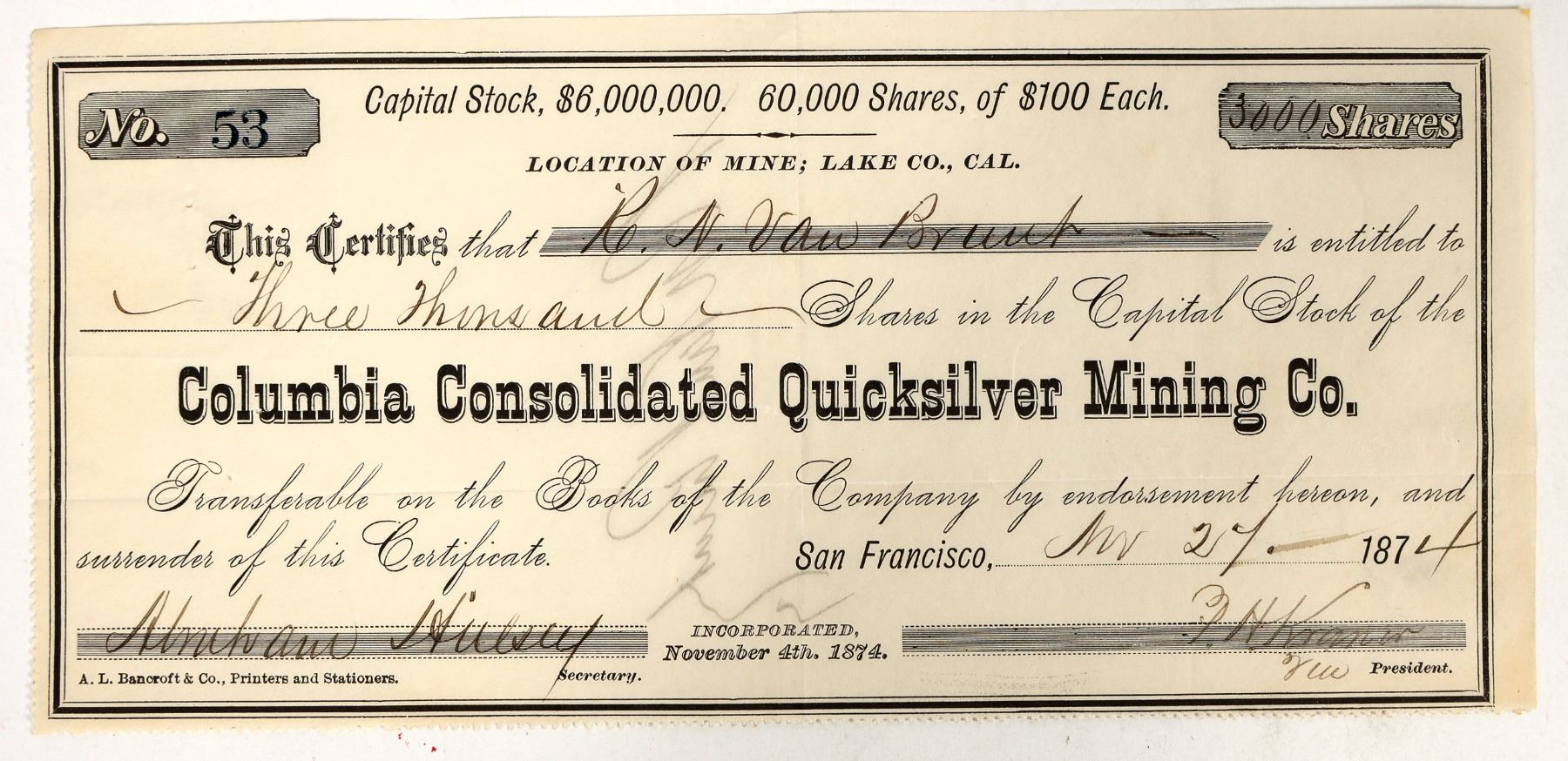 "Location of Mine: Lake Co., Cal." printed at top. Inc. Nov. 1874. No. 53, issued for 3000 shares to RN Van Brunt in San Francisco in 1874. Signed by vice president PH Kramer and secretary Abraham Hulsey. Not cancelled. 4 x 8.5" Folds. No other info located.