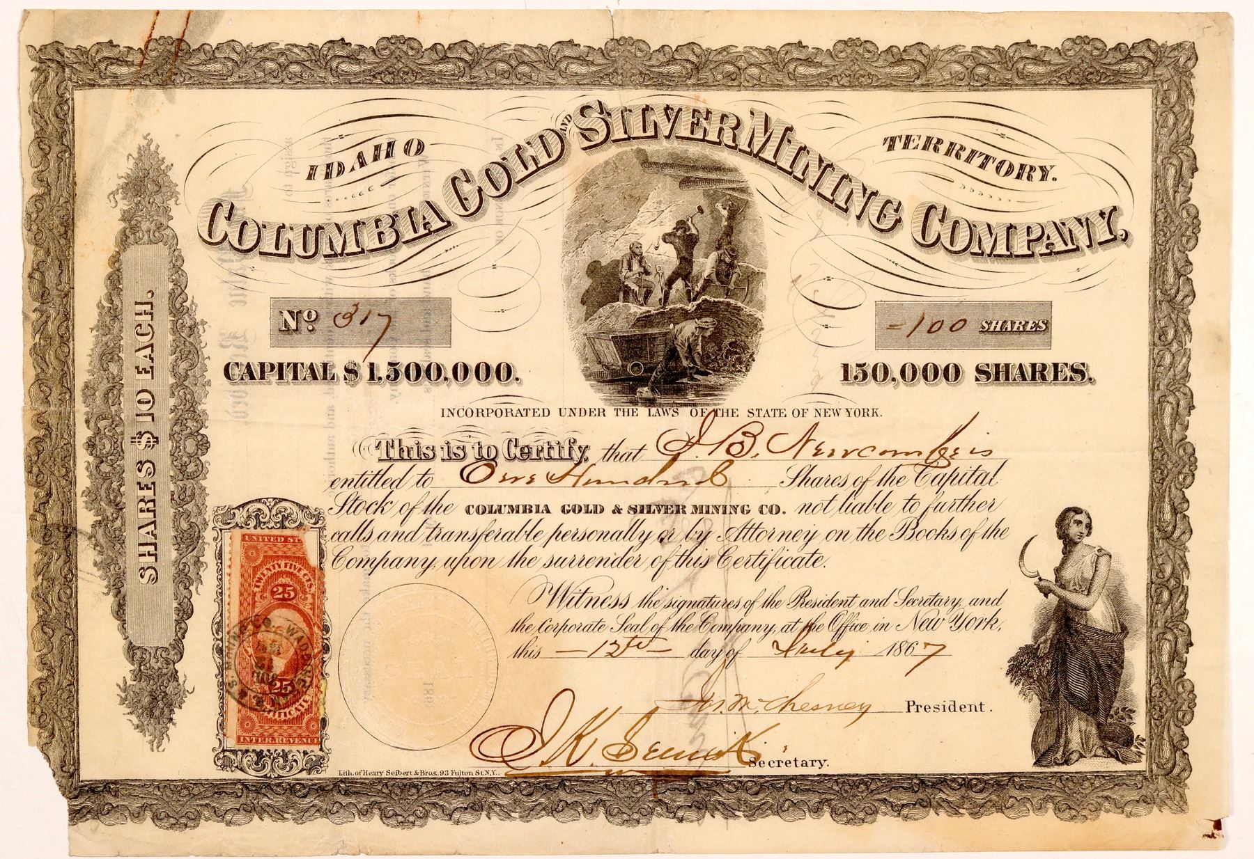 Idaho Territory (printed above the title). Later (1880s) stocks for this company have had the location printed as Saw Tooth District, Alturas County. Inc. in New York. No. 317, issued for 100 shares to (illegible) on July 12th, 1867 in New York. Signed by president Jas. M. Chesney and the secretary (illegible). Not cancelled. Black border and print. Two vignettes: allegorical woman with scythe (bottom right) and underground mining scene (top center). Henry Seibert & Bros. Lith. Pinholes, folds, large stains, missing bottom left corner. 7.5 x 11" 25 cent US IR stamp. Not mentioned in Browne (1868).
