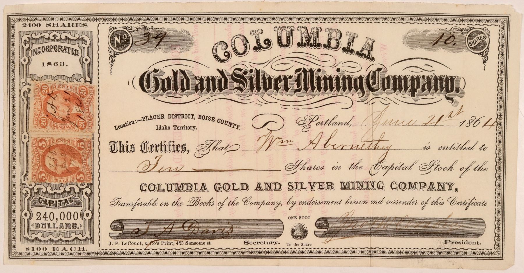 Placer District, Boise County, Idaho Territory (printed under title). I/U #39 Wm Abernathy 10 shares in 1864. Signed by Secretary JA Davis and President McCraken? One corner dogear, 2 small corner chips.