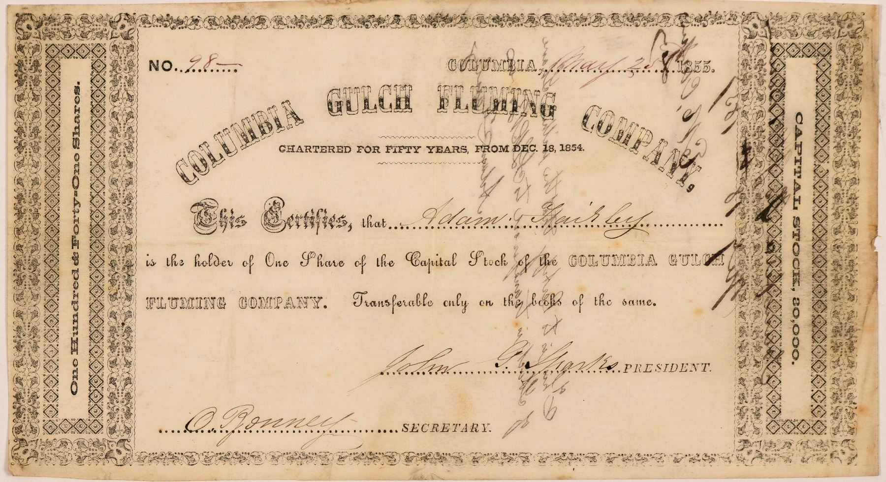 Dateline Columbia, May 25th, 1855. No. 98, issued for one share to Adam Fairley. Signed by president John G. Sparks and secretary O. Bonney. Not cancelled. Ornate logo and border, no vignette. Printed on thin paper. 5.75 x 9.75" Fold, light wear, rough right edge. Competed early on with the Tuolumne County Water Co., but later combined and supplied most of the ditch water used in the county by 1867. Supplied water for the Gold Rush camps of Columbia, Yankee Hill, Gold Springs, Mormon Gulch, Saw Mill Flat, Martinez, Jamestown, Montezuma, Chinese Camp, and others. Columbia was founded in 1850 and known as the "Gem of the Southern Mines." Between 1850 and the early 1900s, $150 million in gold was removed. Ken Prag Collection