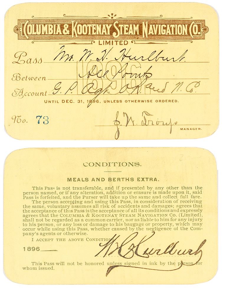 No. 73, issued to Hurlburt, agent for O.R. and N. Co. for 1896. Signed by J.W. Troup as manager. Printed on yellow cardstock. Endorsed by Hurlburt on reverse. Some soiling. This company was incorporated in 1890 and was so successful it was purchased by Central Pacific Railroad in 1897. In addition to a railway, they offered steamer service on Kootenay Lake and then the Arrow Lakes to take advantage of increased mining activity in the 1890s. The Kootenay Gold Rush began as gold was discovered in Wild Horse Creek near the Kootenay River at Fort Steele. Thousands of settlers arrived, mostly from the United States, to stake their claim, and many would stay. (Prag Collection) City: State: Washington / British Columbia Date: Inventory# 39159