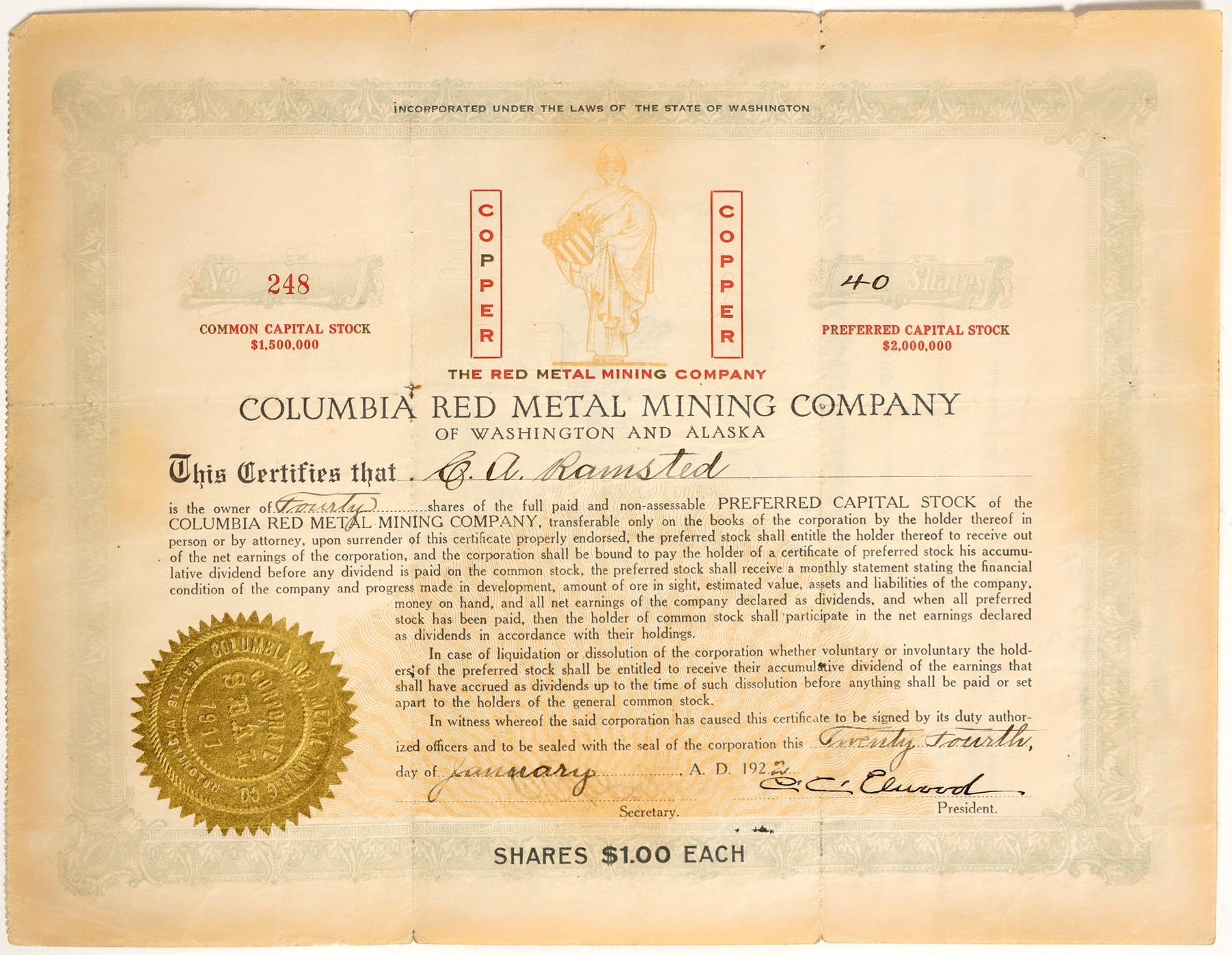 This stock certificate for the Columbia Red Metal Mining Company was issued to C.A. Ramsted in 1922. Columbia Red Metal, as the name implies, is an active copper mine in both Glacier Bay and Valdez, Alaska. roughly 8 n. X 10 in. Slight yellowing at the edges, foxing at two folds. Not found in Hanscom. Please see photo for details.