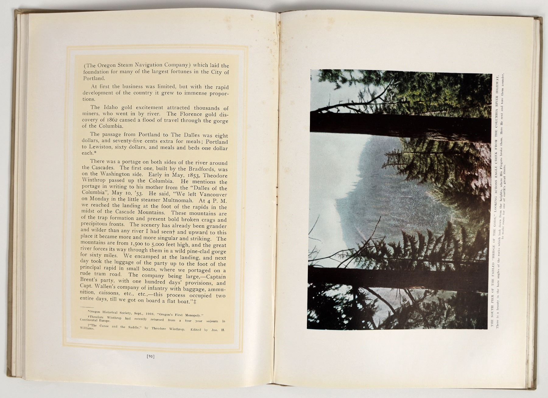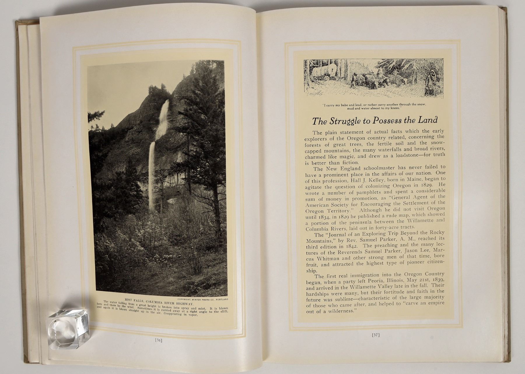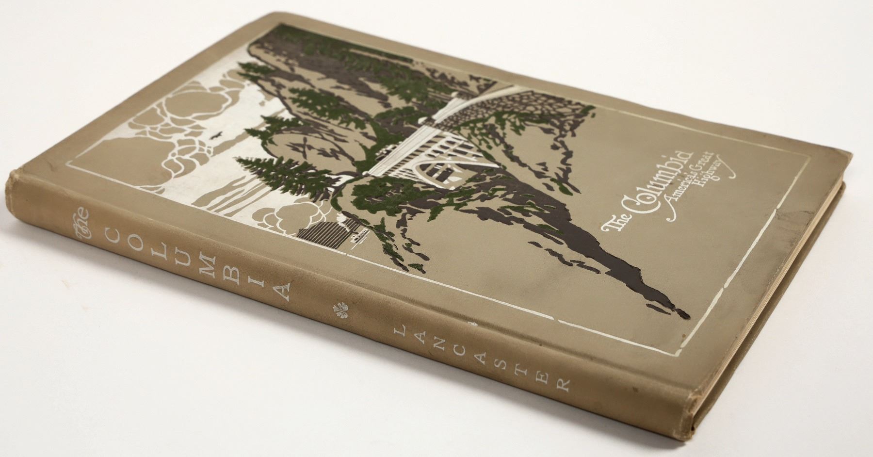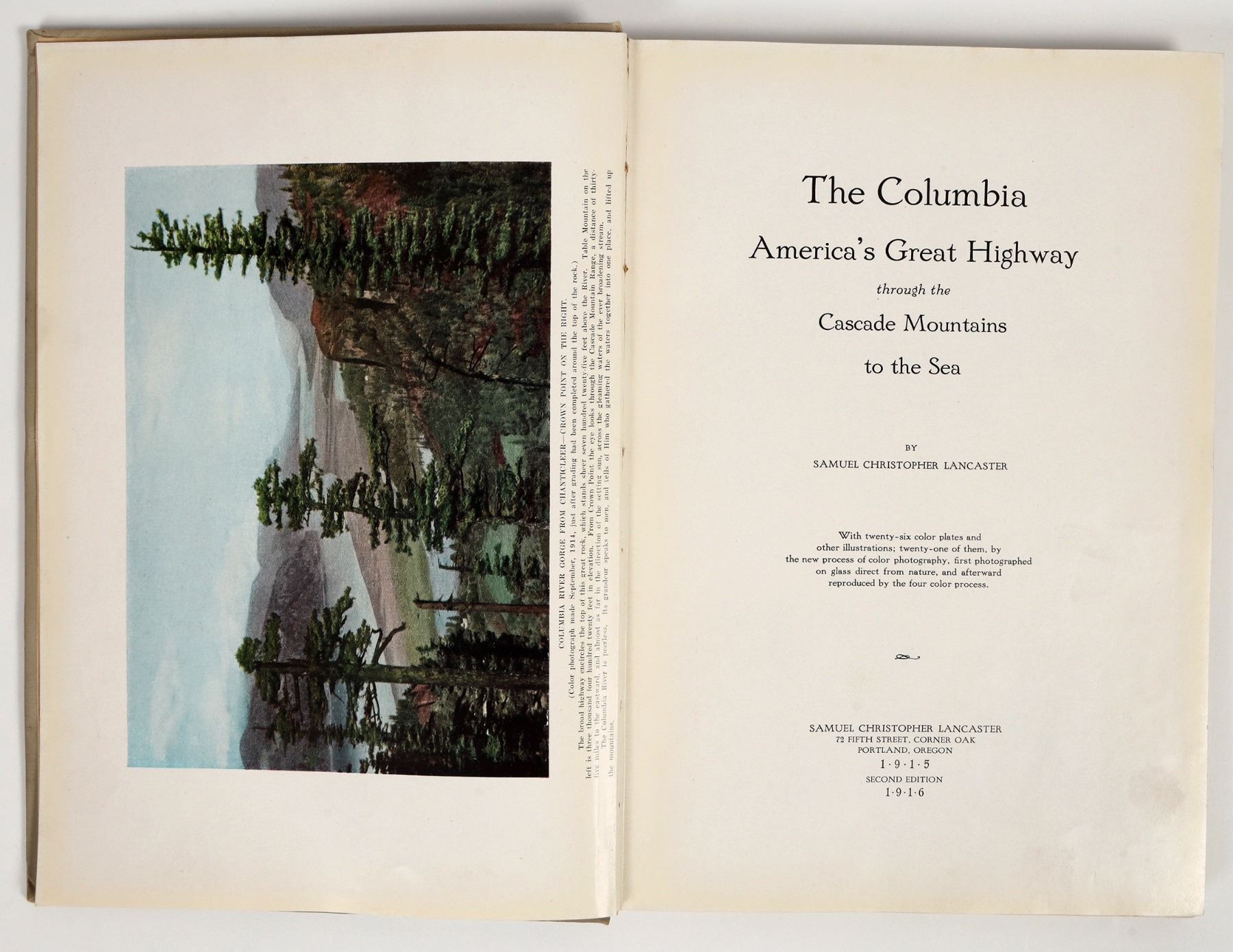 A second edition copy of "The Columbia: America's Great Highway through the Cascade Mountains to the Sea" by Samuel Christopher Lancaster. Originally published in 1915, second edition reprint 1916. An interesting example of early color photography printing, the book is illustrated throughout with both B&W and colorized photos of views along the historic Columbia River Highway. Possibly released to promote the highway. Hardback, 144 pages, fabric binding w/ excellent pictorial cover depicting the highway. Great condition with very minor soiling on cover. See photos. 7.25"x10.25"x.5".