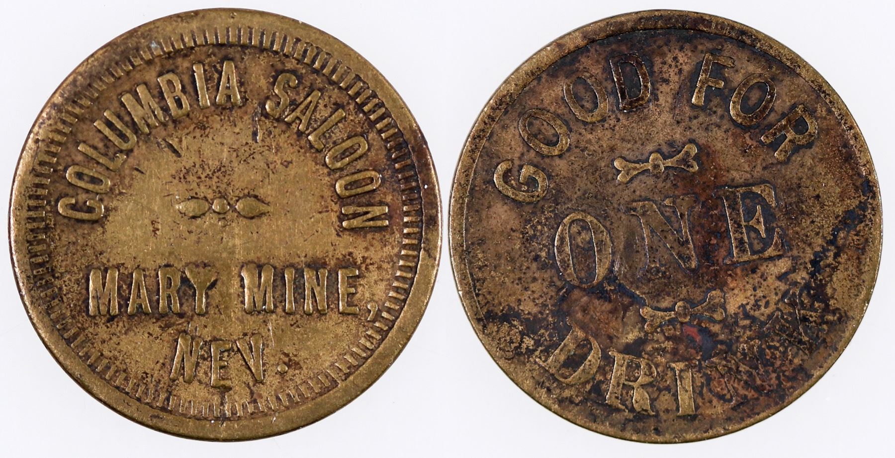 COLUMBIA SALOON / MARY MINE, / NEV. // GOOD FOR / ONE / DRINK; Br., rd., 22 mm.