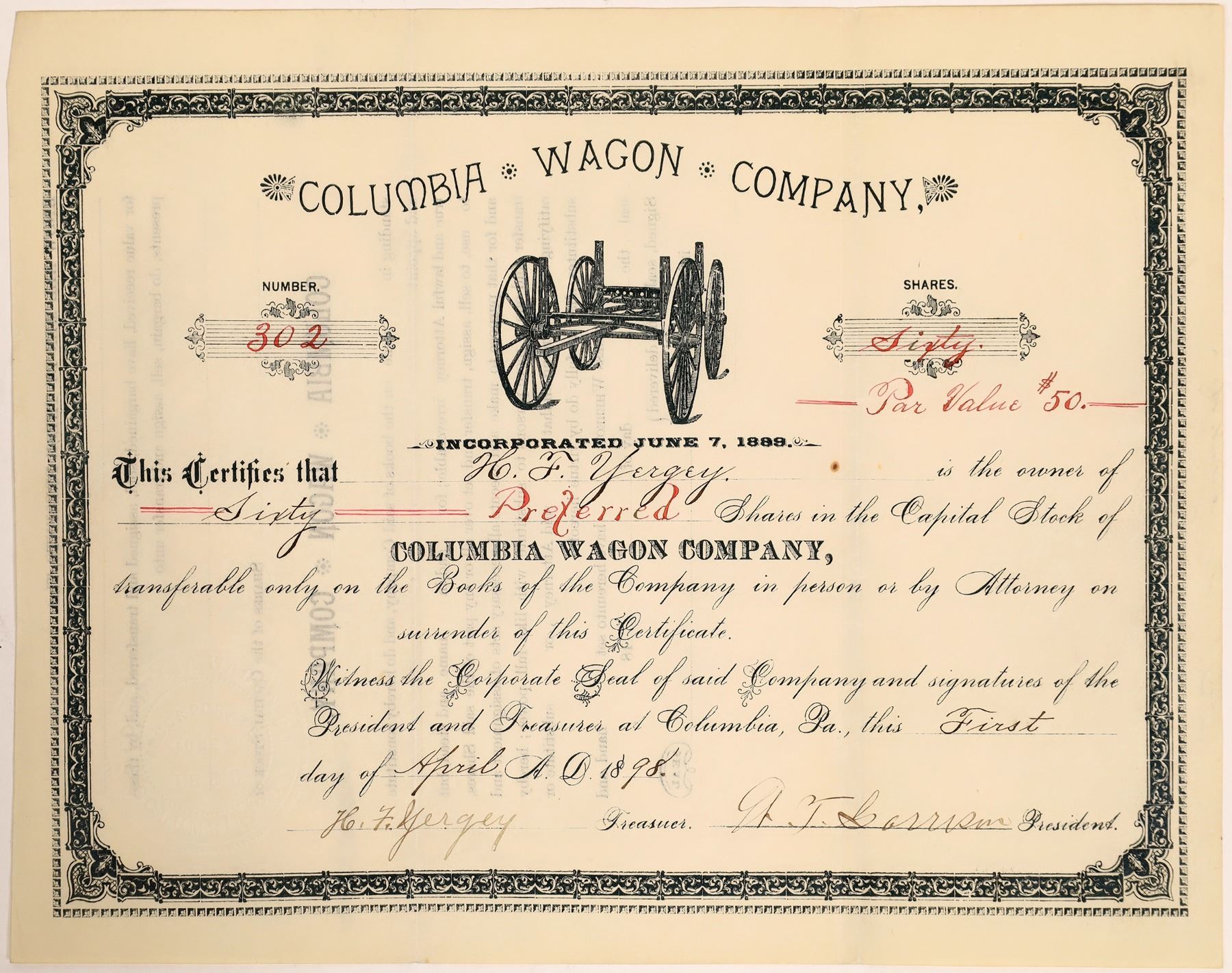 Cert. #302, issued at Columbia, PA. in 1898. Nice vignette of a wagon at the top. Issued for 60 preferred shares to H.F. Yergey, the company secretary and signed by the president, W.T. Garrison. The company were manufacturers and wholesale dealers of farm wagons, dumping wagons, municipal trash wagons, carts & sleighs. In 1889, Garrison resigned his position as treasurer of the Parvin Iron Wagon Co., and relocated to Columbia, Lancaster County, Pennsylvania where he established the Columbia Wagon Company. In 1904, Columbia touted an annual production capacity of 7,000 wagons. In 1906, the company exhibited a rear end dumper. The manufacturer reports a demand for wagons of this design for work where the drop bottom cannot be used, accordingly they make a very heavy wagon strongly ironed for hard usage (coachbuilt.com). The certificate is VF. Uncanceled.