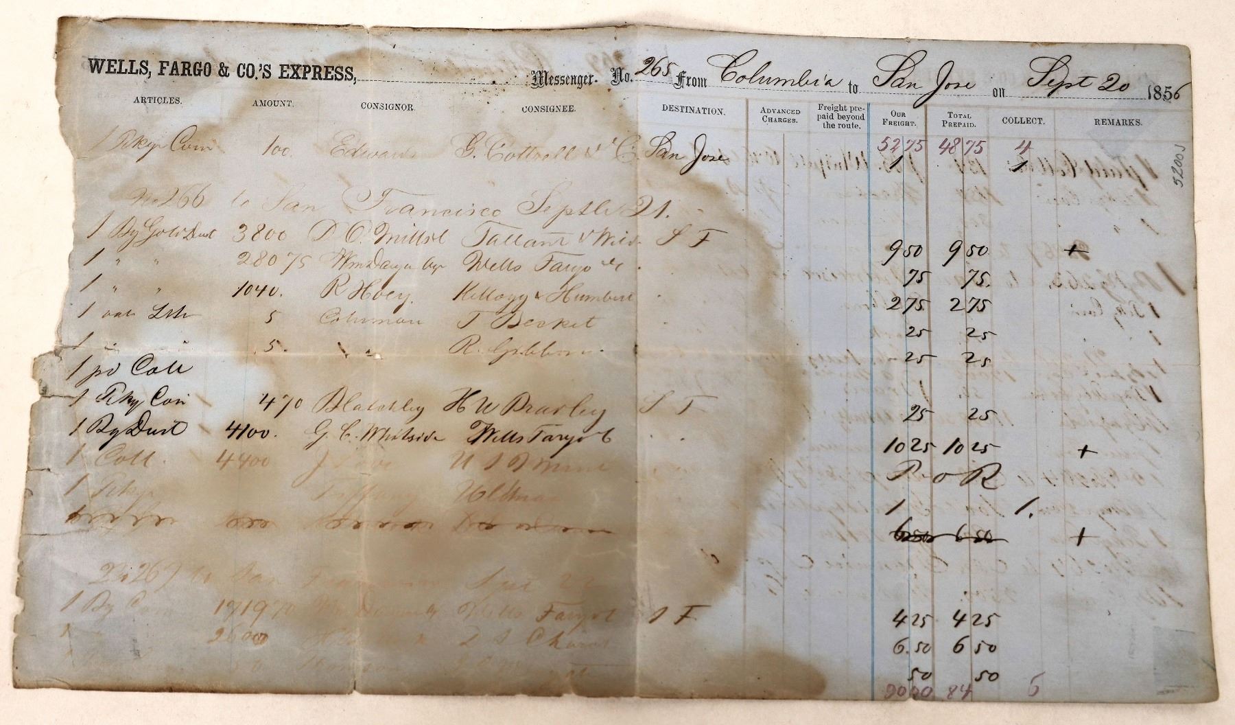 Columbia was one of the absolute key California gold rush mining camps located at the southern end of the mining region near Sonora. Today, it is a California State Park, frozen in time, with many of the original 1850s brick buildings still there for all to see. its history is very rich indeed, as a major gold producer. The 1856 document shows numerous shipments of gold dust and their intended final location. In the middle of one of the two sides shows a gold shipment to Kellogg & Humbert, the huge gold smelting outfit in San Francisco. Other shipments were made to the US Mint in San Francisco and various other Wells Fargo offices.