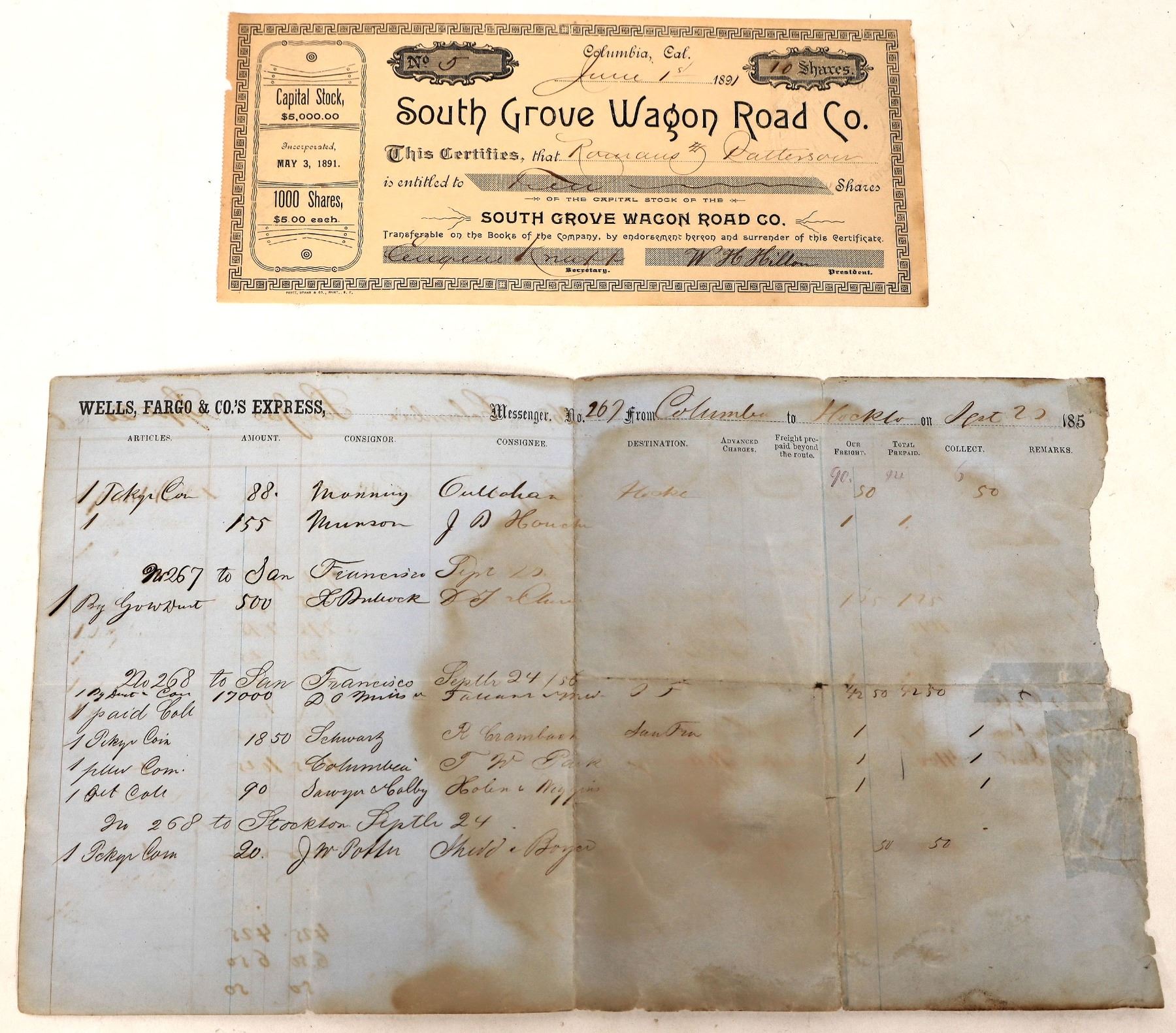 Columbia was one of the absolute key California gold rush mining camps located at the southern end of the mining region near Sonora. Today, it is a California State Park, frozen in time, with many of the original 1850s brick buildings still there for all to see. its history is very rich indeed, as a major gold producer. The 1856 document shows numerous shipments of gold dust and their intended final location. In the middle of one of the two sides shows a gold shipment to Kellogg & Humbert, the huge gold smelting outfit in San Francisco. Other shipments were made to the US Mint in San Francisco and various other Wells Fargo offices.