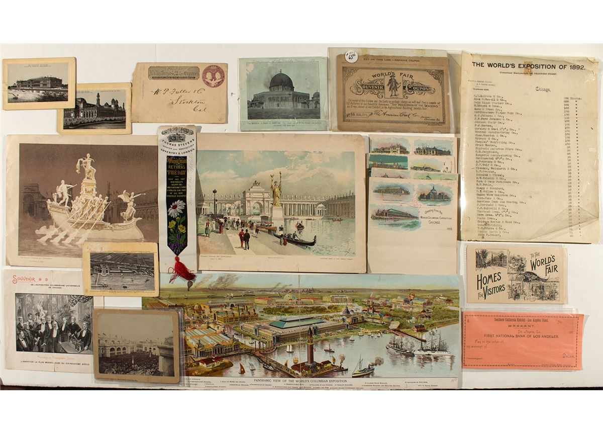 Varied group. Please inspect. Includes: two page list of shareholders on World's Exposition of 1892 lettersheet; three illustrated cards (3.25" x4.75"); color ribbon with floral pattern for Thomas Steven, inventor & manufacturer; four diff. unused illust. lettersheets; Wells Fargo cover with exposition two-cent stamp; three diff. small pamphlets (Homes for Visitors, Edison Phonograph (in French), Oriental Bazaar); photograph on cardstock (4.25' x 5.25"); Warrant for the Southern California Exhibit, Los Angeles Fund; three different illustrations, including a 6.5" x 19" panorama; and an unused Souvenir Coupon. (Prag Collection)