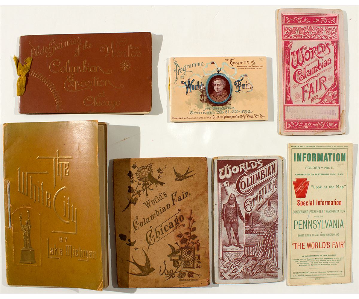 Seven different. 1) "Photo-gravures of the World's Columbian Exposition at Chicago," A. Wittemann, 1893, 12 different views. 2) "The White City by Lake Michigan, A Souvenir in Albertype." A. Wittemann, 1893. 30 views on 15 pages. 3) Programmer of Ceremonies Attending the Dedication of the Buildings of the World's Fair," (Compl. of the Chicago, Milwaukee & St. Paul Ry. Co.). 4) Three different booklets with fold-out (accordion style) illustrations cards. All three printed in Germany. 5) Brochure for Pennsylvania Short Line with map (15.5" x 21"). (Prag Collection)