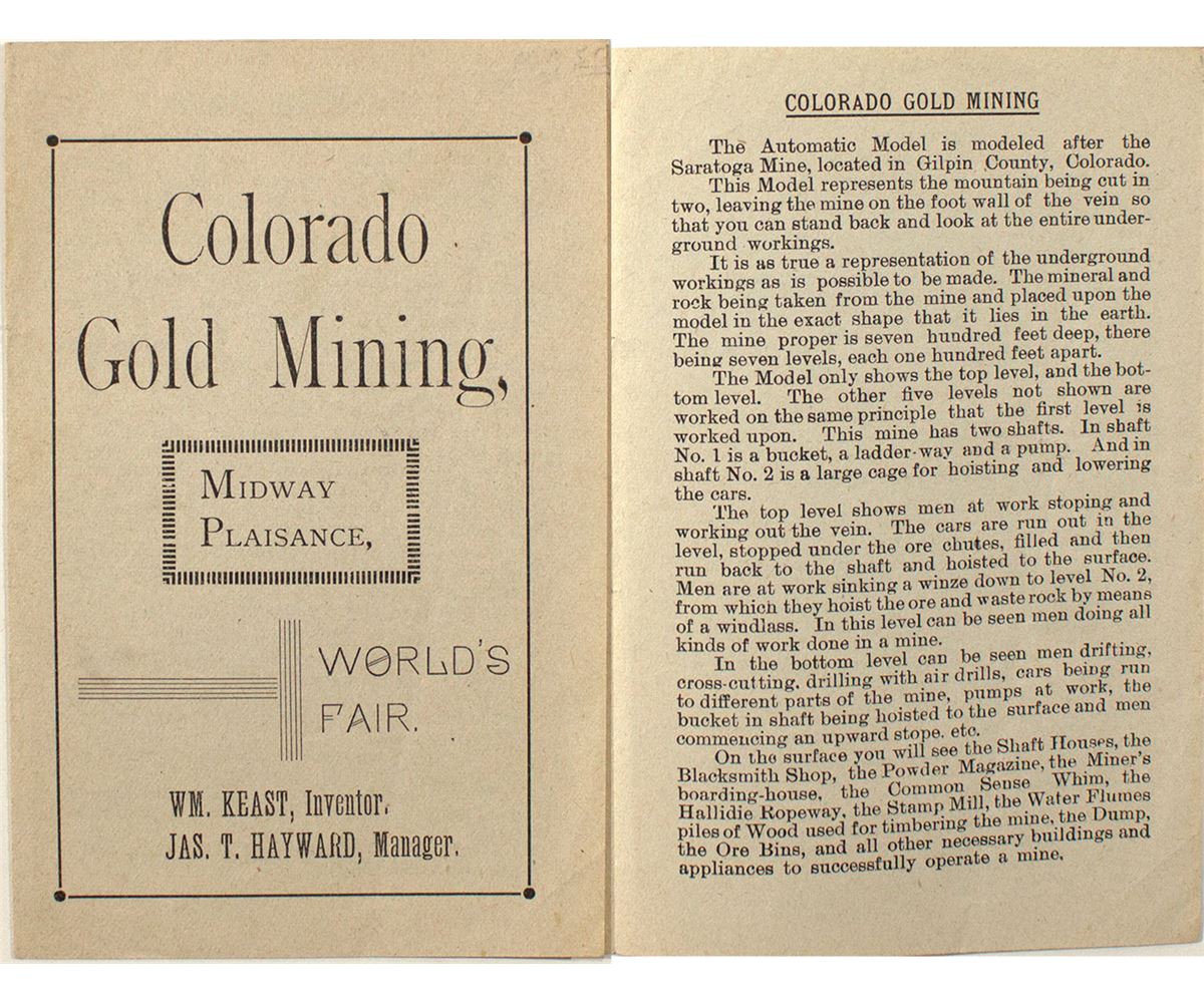 Colorado Gold Mining, Midway Plaisance, World's Fair. Three page pamphlet discusses an exhibit at the expo.: an Automatic Model of a mine created by "William Keast, a miner, who worked upon it for four and one-half years." The model is based on the Saratoga Mine in Gilpin County, Colorado. Claims "you cannot get a better idea of the underground workings of a mine by examining this model than if you spend a month in a mine." No picture or illustration. 5.5" x 3.5" (Prag Collection)