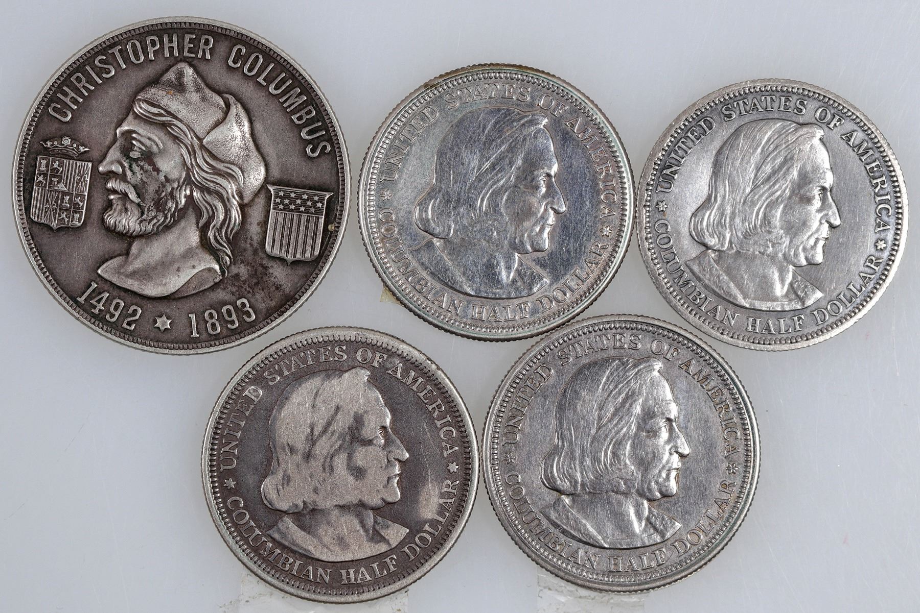 Four examples of HK-154: F-VF condition. Also a Columbian Exposition whist counter (38 mm), white metal.