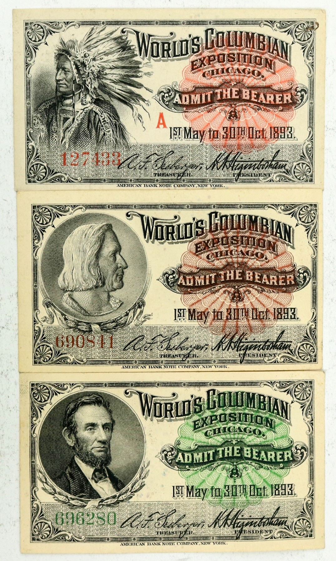Lot of 3. Admission tickets to the 1893 Columbian Expo. In plastic holders. Near new condition. These are rare and difficult to find in this condition. Great vignettes on each one. Pres. Lincoln on one. An Indian Chief . American Bank Note Co. printer.