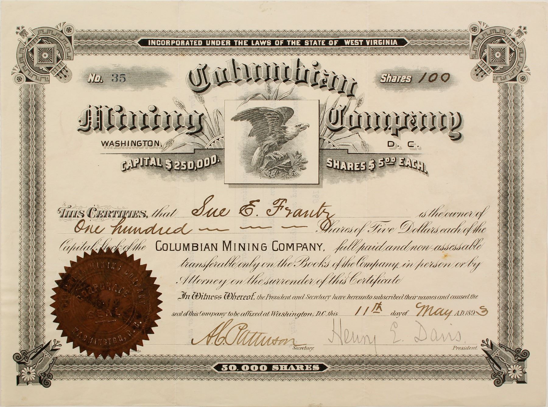 I/U #35 Sue Frantz 100 shares 1893. Signed by President Davis.