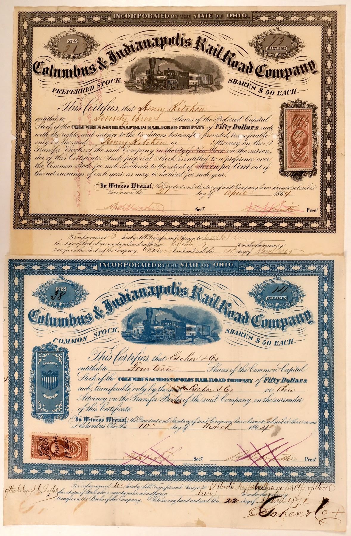 This lot includes two certificates, both issued in 1864. The preferred stock, cert. #21, was issued for 73 shares at $50 each. Train r-l in front of roman style building. Hole and pen cxled. Black on creme. The common share certificate is #38, issued for 14 shares. Same vignette as the preferred stock. Blue print on creme. Both have revenue stamps . A nice pairing.