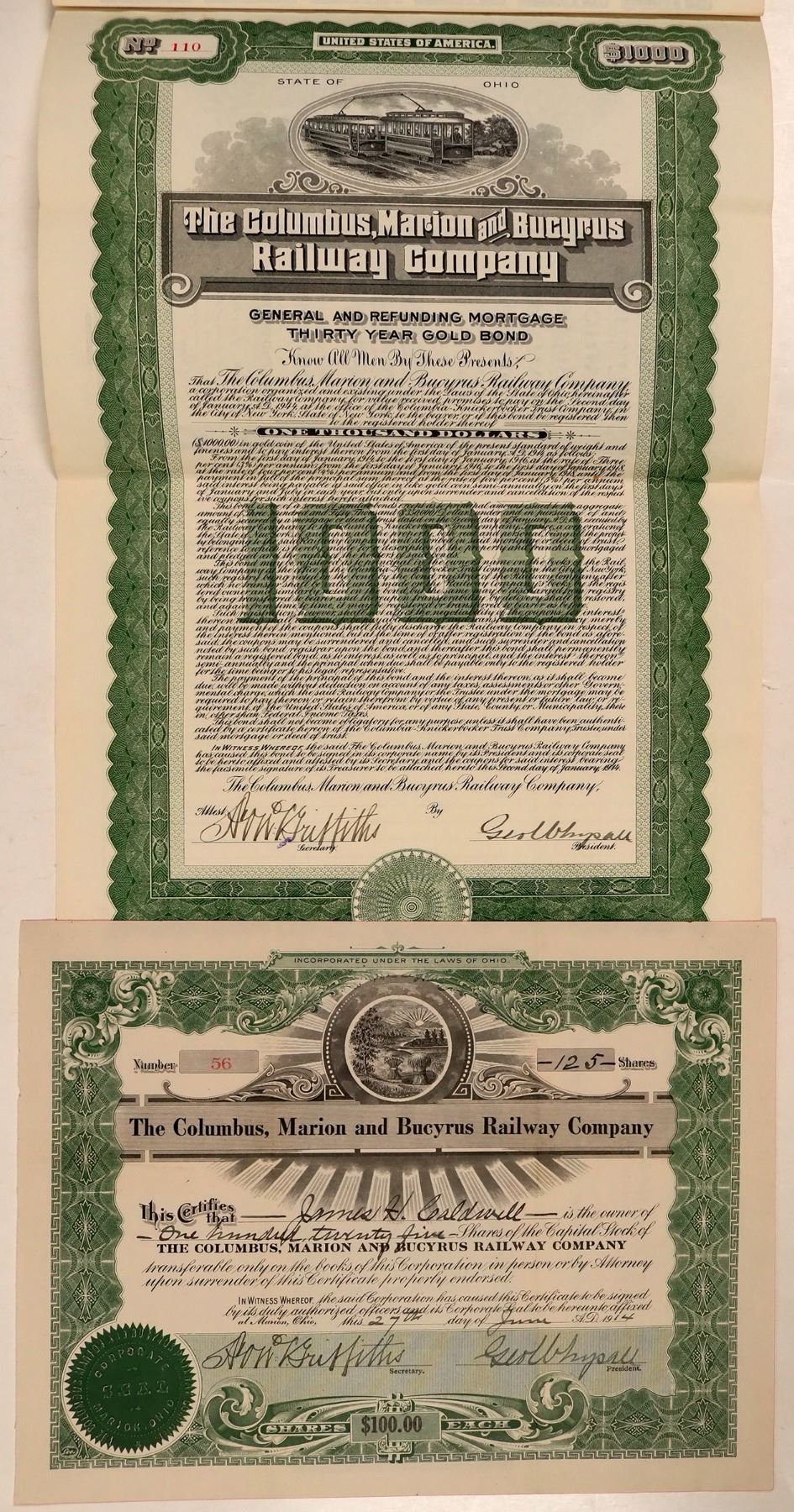 Two certificates, a common stock and a bond. Stock was issued for 125 shares in 1914. Ohio state seal vignette at the top. Shares were $100 Each. Green. Black on creme. Uncancelled. Bond was issued in 1914. $1,000 General and Refunding Mortgage Thirty Year Gold Bond. Due in 1944. Vignette of two electric streetcars running parellel to each other. Black print on creme with green borders. Coupons attached at the front. Globe Litho, N.Y. Uncancelled. Both certificates in very good condition.